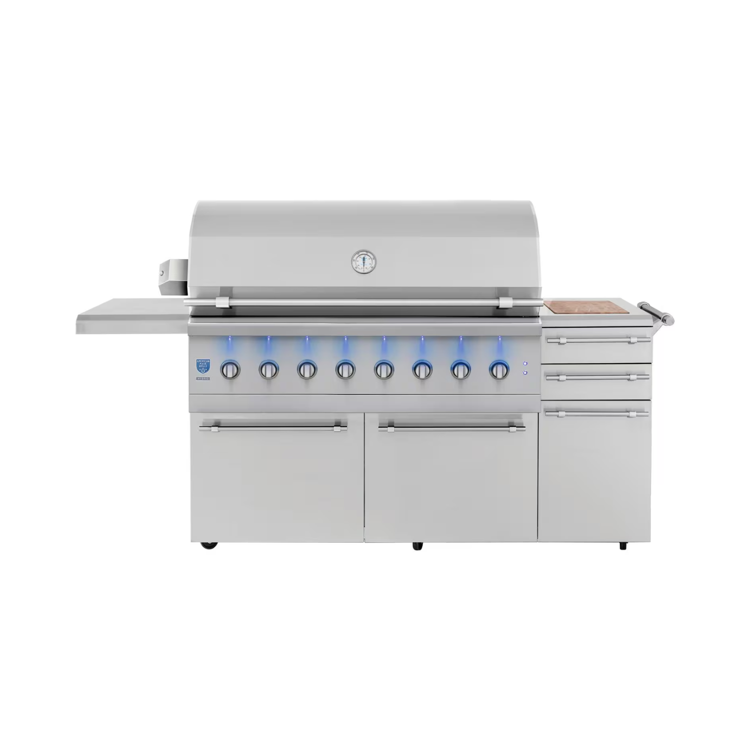 XL fuel drawer, utensil drawer, dedicated tank drawer (LP) or accessory bin (NG), folding side shelf with removable cutting board, towel holder, and 360° locking casters.