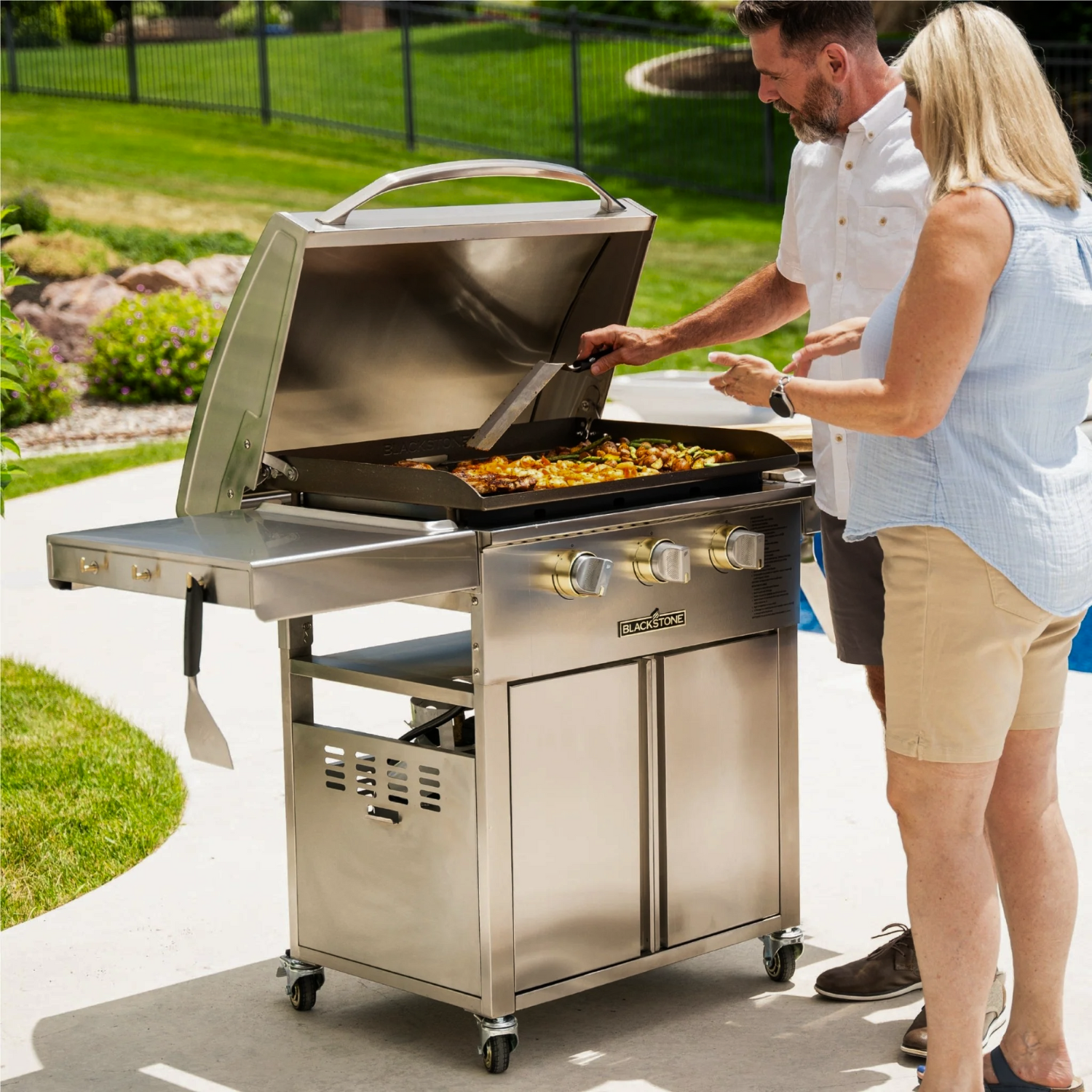 Transform your outdoor cooking with the Blackstone Select 28” Omnivore Griddle with Cabinet featuring a sleek fusion of accuracy, sophistication, and ease. Crafted from durable 304 grade stainless steel, this 28” griddle boasts a design that expands the versatility of your outdoor kitchen. Its integrated propane storage cabinet offers ample room for all your griddling essentials and seasonings. Experience enhanced accuracy with the innovative Omnivore Griddle Plate Technology and three independently controlled burners, allowing you to create a variety of dishes simultaneously. From morning crepes to evening steaks, this dynamic and efficient griddle is a backyard champion.