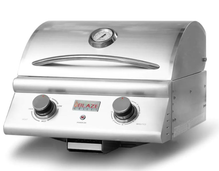 The Blaze Electric Grill allows you to enjoy quality grilling in more places than ever. This 21-inch electric grill is built with a 304 stainless steel body and features a water-resistant design for safe use outdoors. The 274 square inch cooking surface reaches up to 749 degrees Fahrenheit and is evenly heated by a full-sized 1,500 watt heating element. 16-gauge 304 stainless steel flame tamers help prevent flare ups, evenly distribute heat, and vaporize drippings for extra flavor. Heavy-duty 9mm triangular stainless steel cooking rods allow for greater heat transfer to create impressive sear marks. A removable warming rack lets you keep bread and other foods heated while you grill. The heating element has a hinged design and can be lifted out, while an easy pull-out drip tray collects drippings for easy cleanup. The 304 stainless steel grill hood is double-lined to protect the outer layer from heat discoloration, keeping your Blaze grill looking shiny and new for years of use. The included pedestal base features durable 304 stainless steel construction and folding side shelves for convenient work area. Safety features include a built-in 60-minute timer with automatic shut-off, and a heavy-gauge 7.5 foot power cord with built-in GFCI breaker. A dedicated 20 AMP circuit is recommended for best performance, however a dedicated 15 AMP circuit is also acceptable. This product is ETL certified.