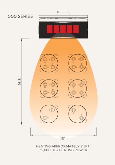 Delivering 39,800 BTU of deep-reaching radiant heat, the Platinum 500 effectively warms areas up to 200–215 sq. ft., outperforming traditional open-flame or convection heaters.
