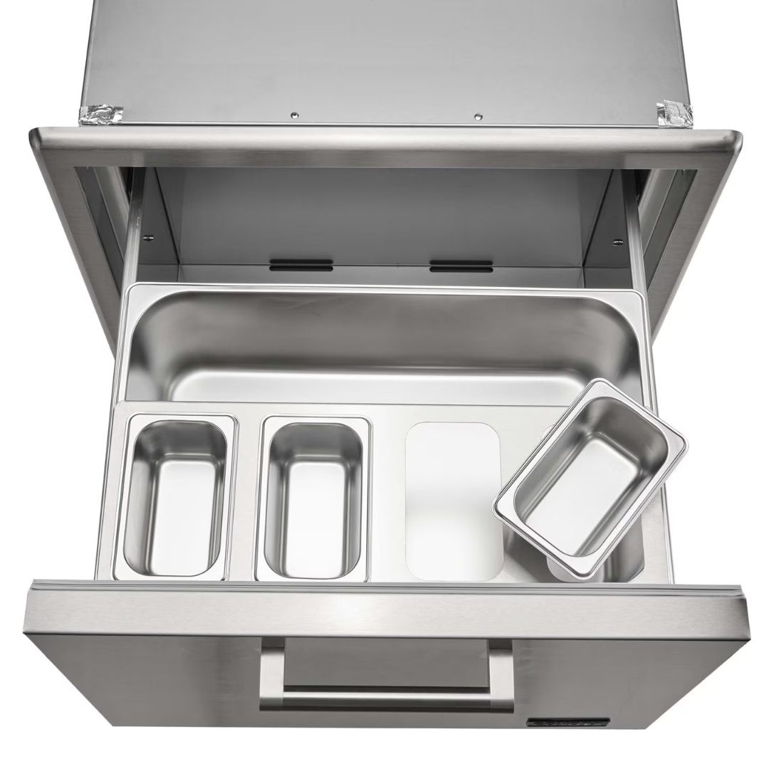 Easy‑Access Cold Zone – Guests and chefs can grab chilled refreshments without leaning into a deep chest; the lift‑out condiment tray keeps garnishes crisp and ready.