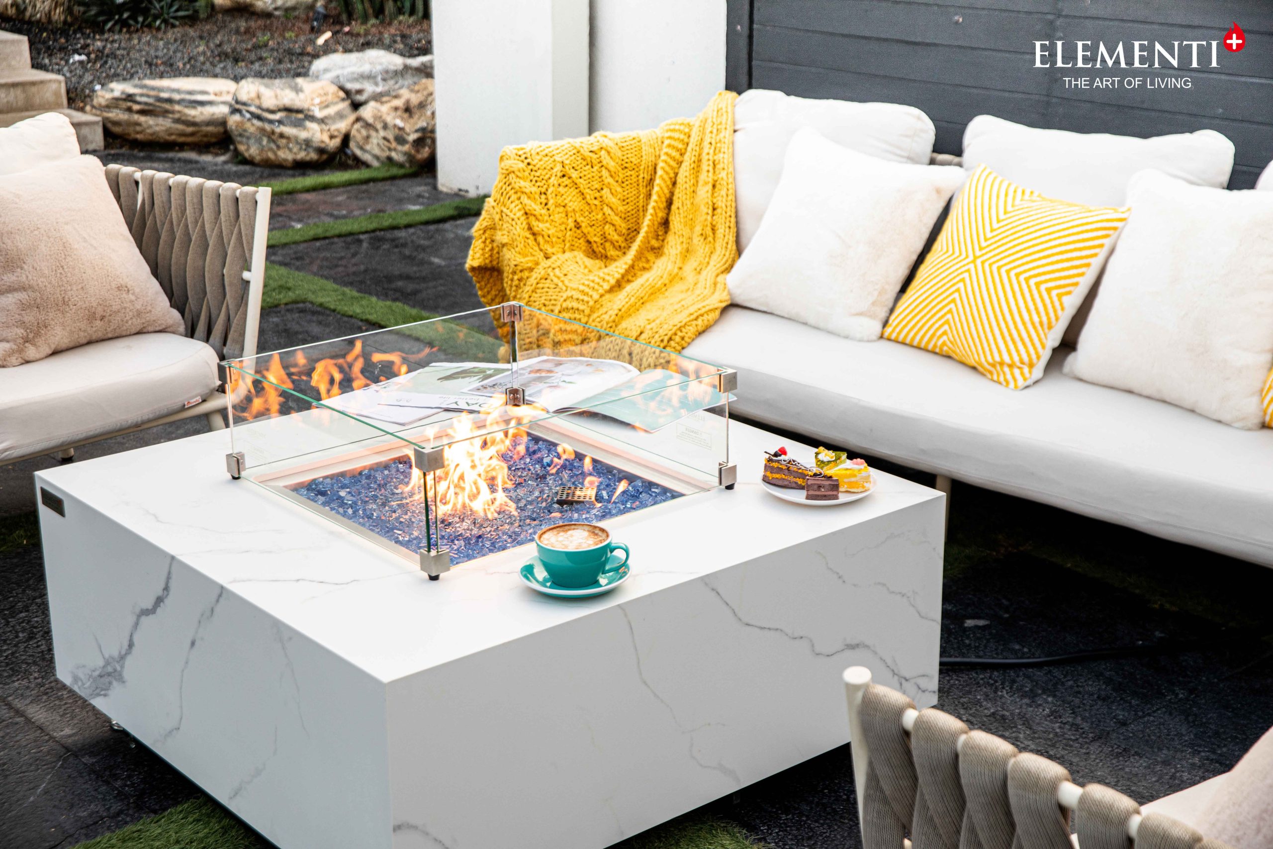 Transform your patio, garden, or poolside into a luxurious outdoor oasis with the Elementi Plus Bianco Marble Porcelain Fire Table. Blending modern elegance with industrial-strength durability, this 39.5-inch square fire table delivers 60,000 BTUs of roaring warmth and captivating ambiance, perfect for intimate gatherings or serene evenings under the stars.