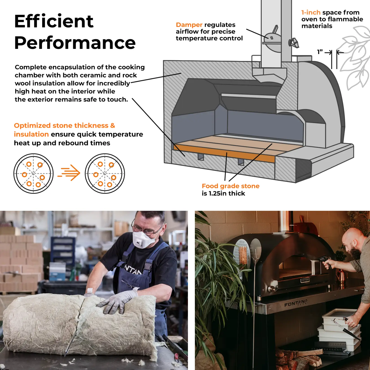 Reflective steel walls and aerospace-grade insulation stretch every BTU: a single 20-lb propane tank yields ≈ 20 hours of cook time, while a modest log bundle fuels marathon pizza sessions with minimal ash.