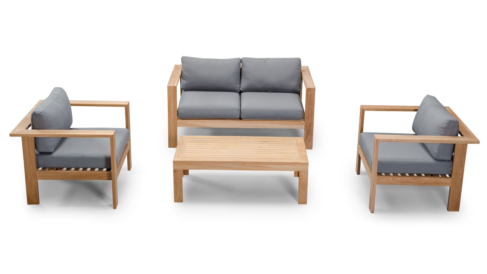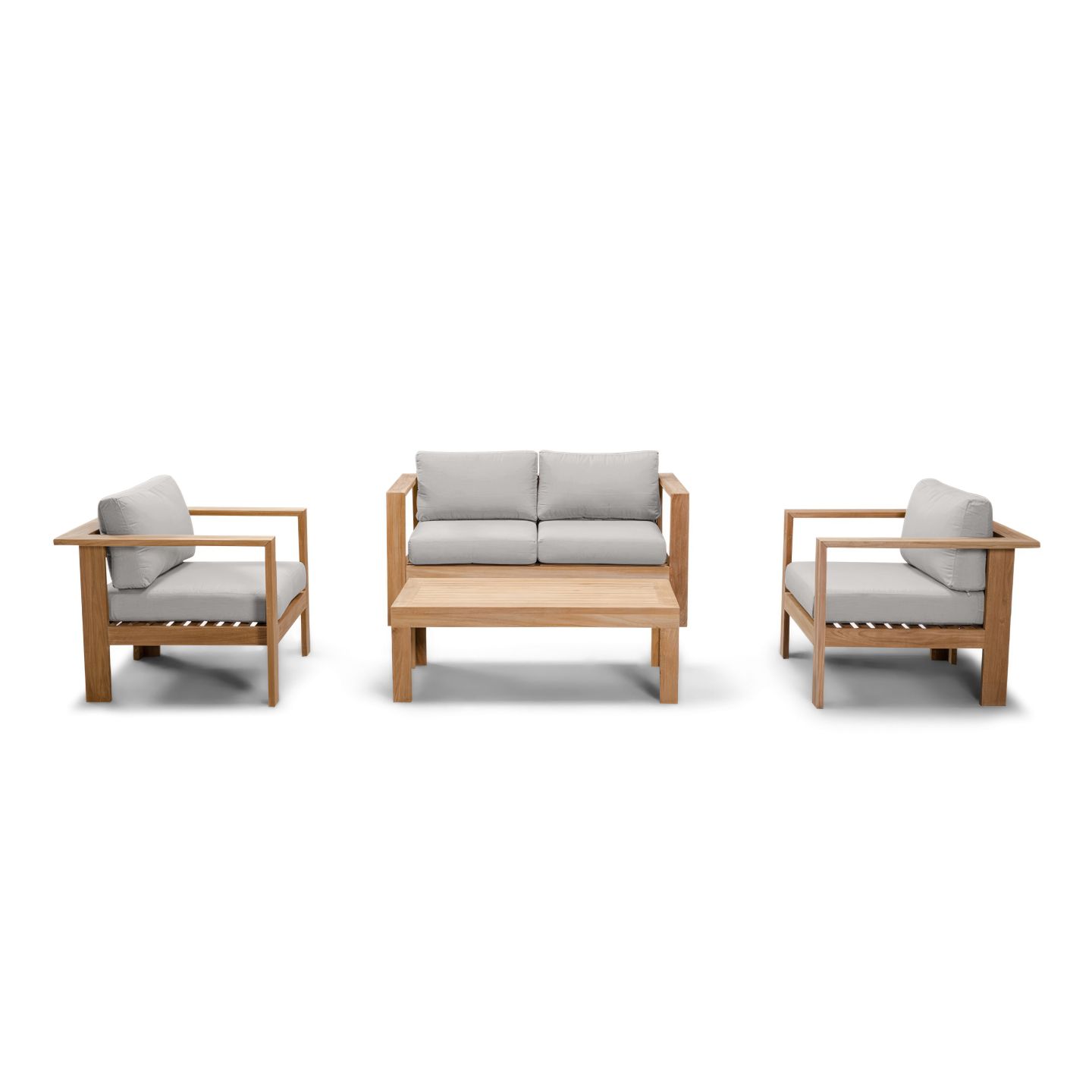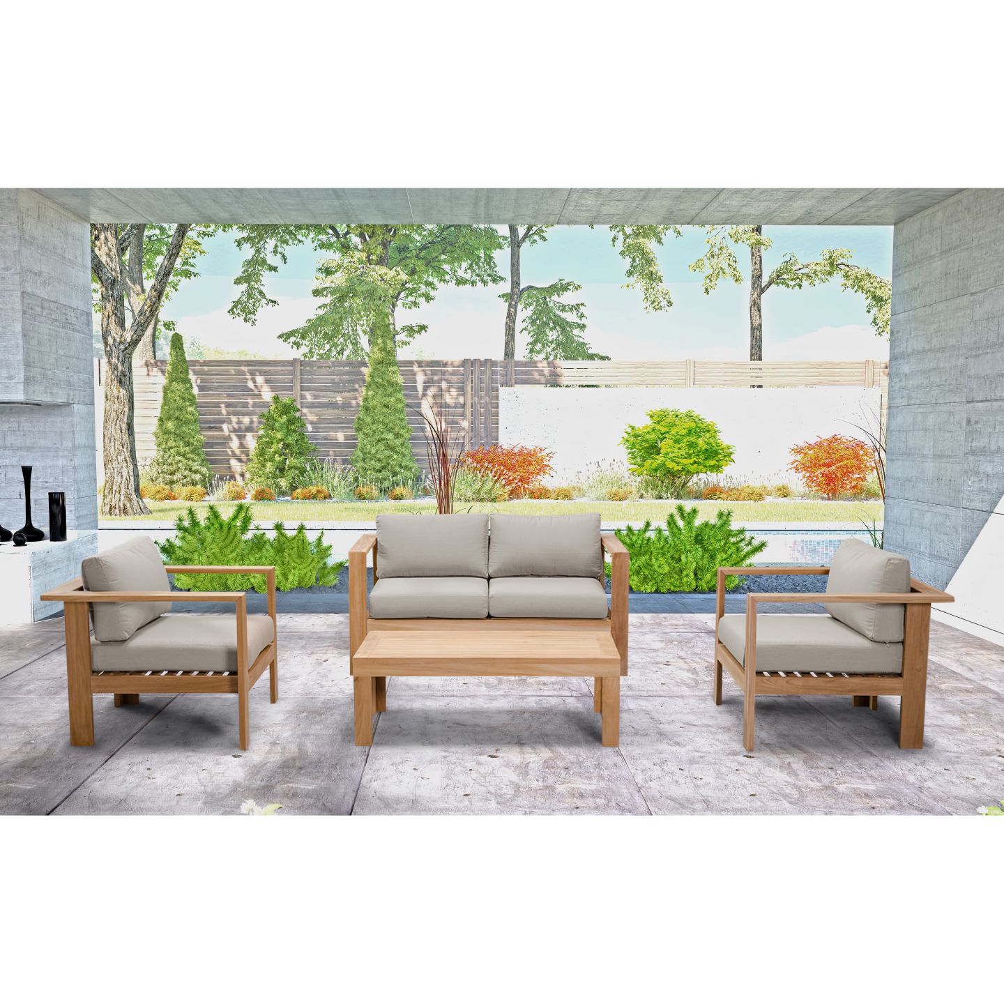 The 4 Piece Ando Loveseat Set by Harmonia Living will bring stylish comfort and relaxation to your favorite outdoor setting. Crafted from sustainably harvested teak, this line of outdoor furniture will perform well in any climate, rain or shine. The simple, modern elegance of its boxed arms and its gently aged appearance will create a warm, natural feel in any outdoor setting. All-weather, fade resistant cushions provide even more comfort and are designed to endure the elements. All cushions are made in the USA from Sunbrella performance fabrics which carry a 5 year fade warranty.