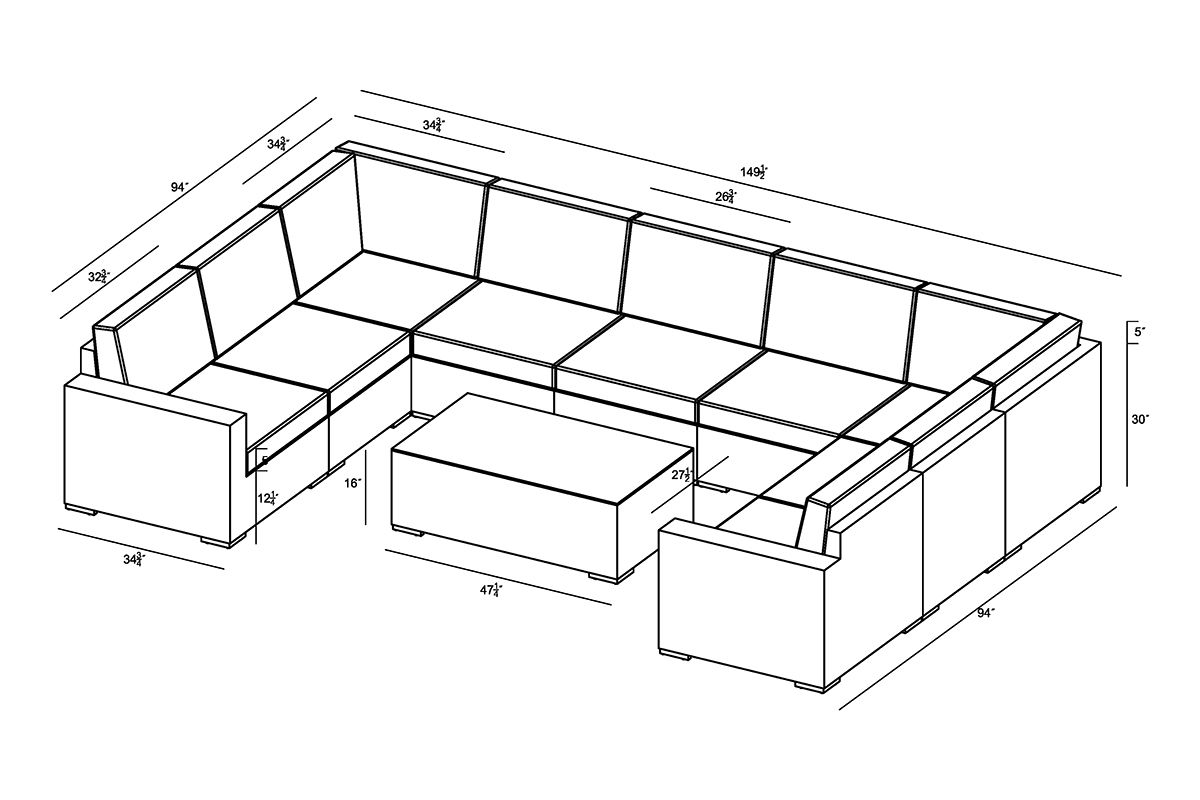 The Arden 10 Piece Surround Sectional Set by Harmonia Living brings a cozy, rustic appeal to modern outdoor dining furniture. This collection’s high arms, modern style and extra-plush cushions give it a unique visual appeal, while sturdy, all-weather construction ensures lasting performance across the seasons. The wicker is made with durable High-Density Polyethylene (HDPE) and finished in a beautifully textured Chestnut color, which gives it a natural feel. Its sturdy aluminum frame, triple reinforced seats and fade resistant cushions are made to endure in any outdoor setting, rain or shine. The tables are topped with extra strong tempered glass, a finishing touch that is ideal for frequent use. If you wish to order this set through Harmonia Living’s Quick Ship program, make sure to select a Quick Ship (QS) fabric before checkout! All cushions are made in the USA from Sunbrella, Outdura, and Revolution performance fabrics which carry a 5 year fade warranty. This set comes with 5 Middle Sections, 1 Left Arm Section, 1 Right Arm Section, 2 Corner Sections and 1 Rectangular Coffee Table, perfect for your patio or outdoor lounge.