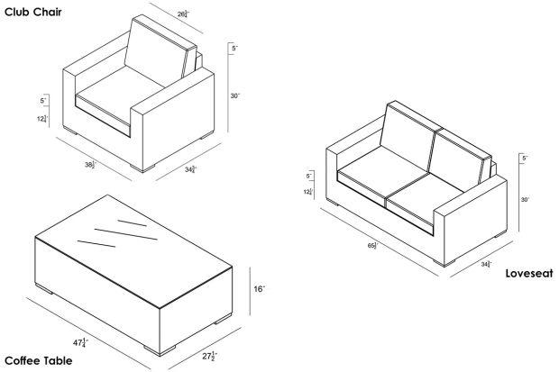 - Loveseat: 65.5″W x 34.75″D x 32″H (54lbs.)