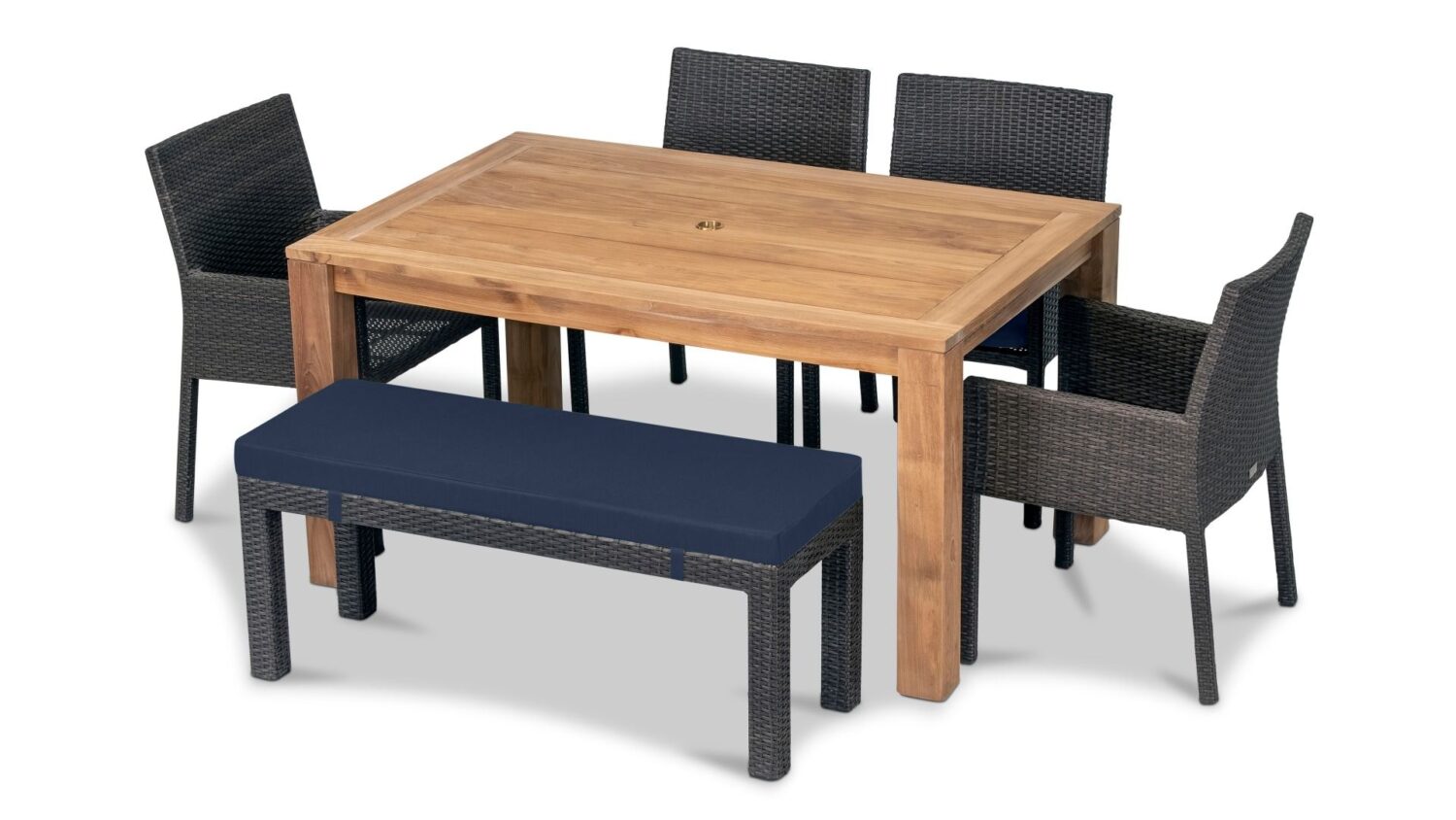The Arden Teak 6 Piece Bench Dining Set by Harmonia Living brings a cozy, rustic appeal to modern outdoor dining furniture. This collection’s modern wicker style, teak table and extra-plush cushions give it a unique visual appeal, while sturdy, all-weather construction ensures lasting performance across the seasons. The wicker is made with durable High-Density Polyethylene (HDPE) and finished in a beautifully textured Chestnut color, which gives it a natural feel. Its sturdy aluminum frame, double reinforced seats and fade resistant cushions are made to endure in any outdoor setting, rain or shine. The table is made with reclaimed teak wood and topped with extra strong tempered glass, both ideal for frequent use outdoors. If you wish to order this set through Harmonia Living’s Quick Ship program, make sure to select a Quick Ship (QS) fabric before checkout! All cushions are made in the USA from Sunbrella, Outdura, and Revolution performance fabrics which carry a 5 year fade warranty. This set comes with 6 Dining Chairs and 1 Classic Rectangular 6-Seater Table, perfect for your patio or outdoor lounge.