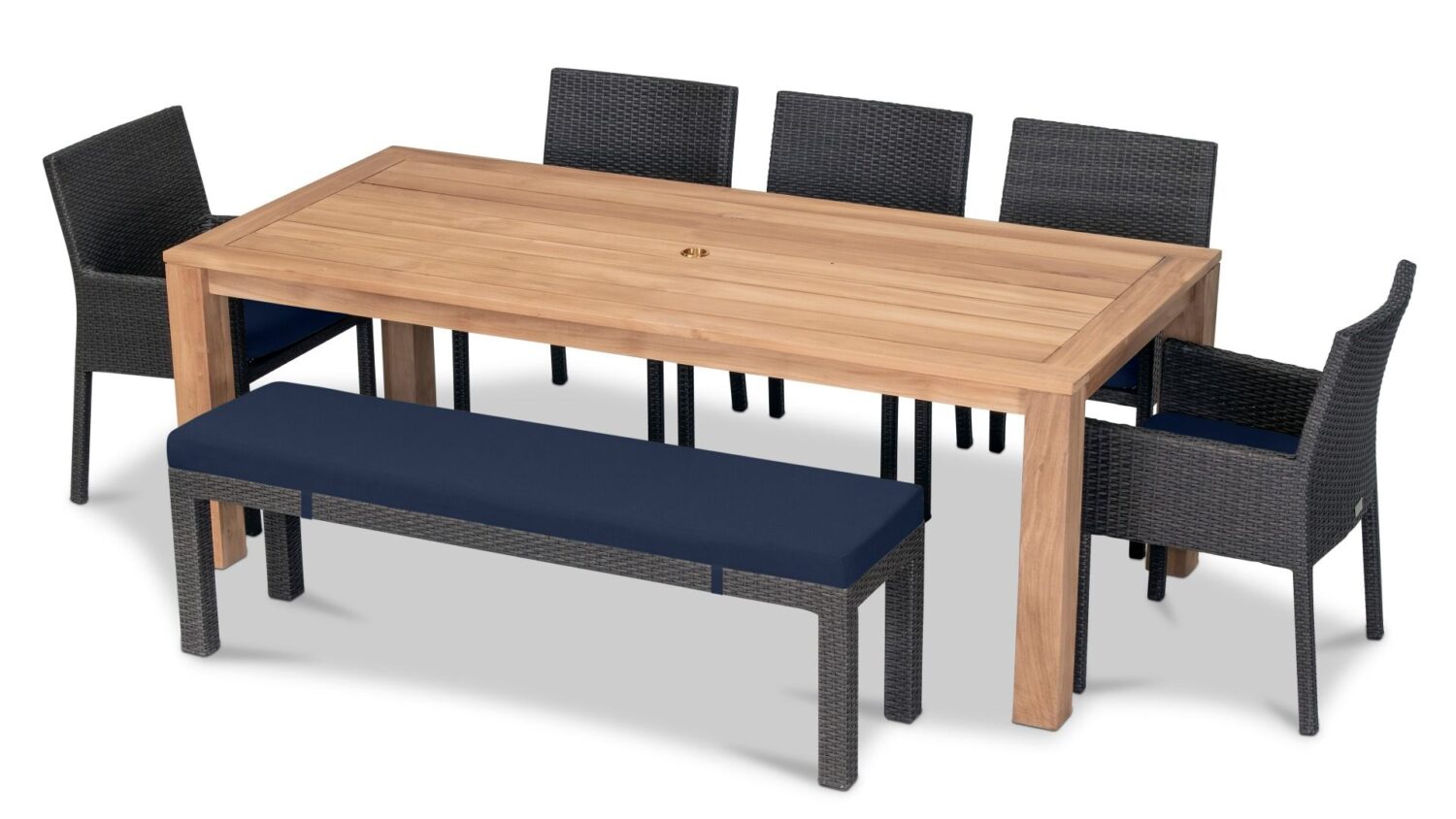- Pre-cut umbrella hole with brass plated umbrella hole cover, umbrellas with a pole diameter up to 1.5″ will fit into this dining table.