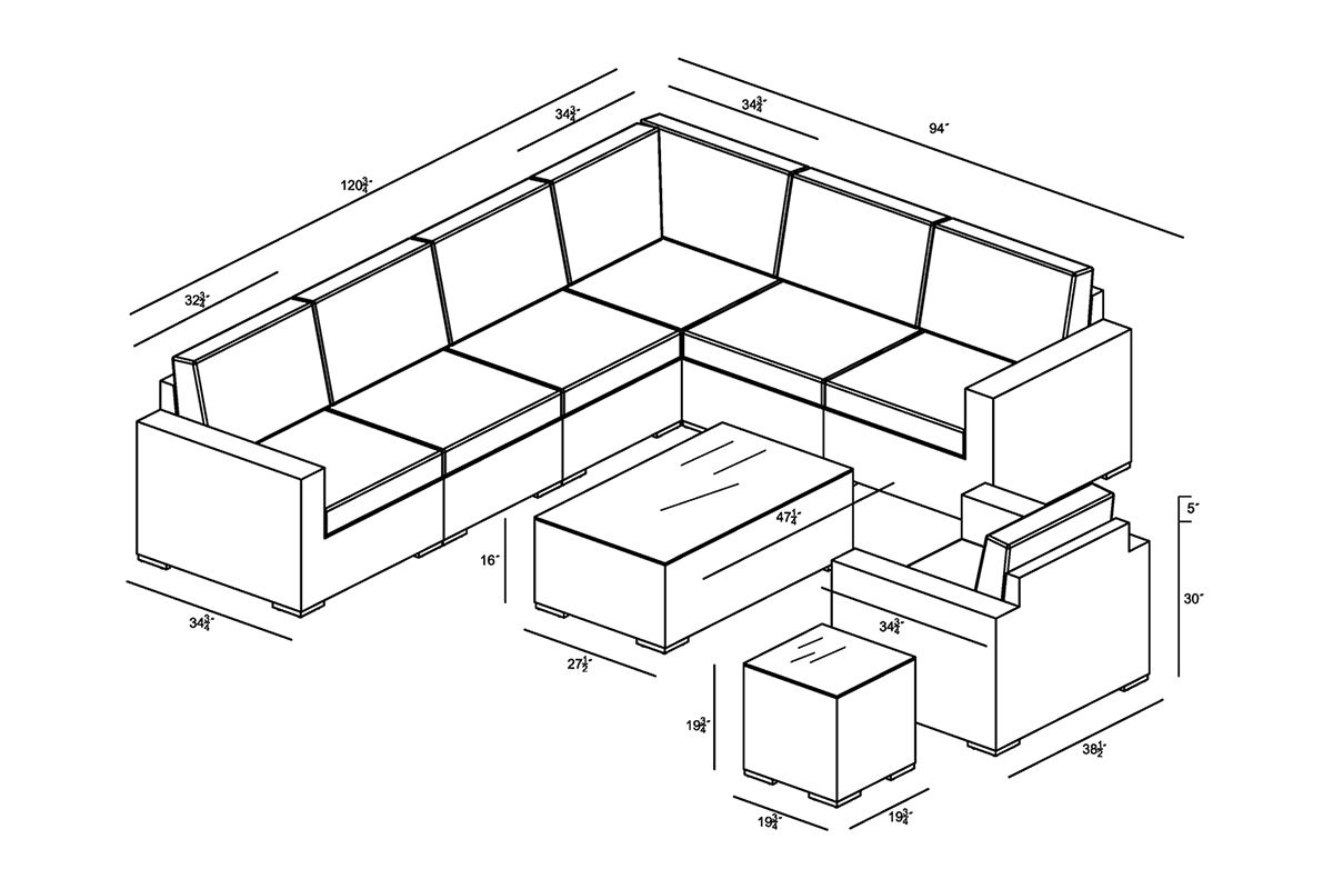 - Left Arm Section: 32.75″W x 34.75″D x 32″H (33lbs.)