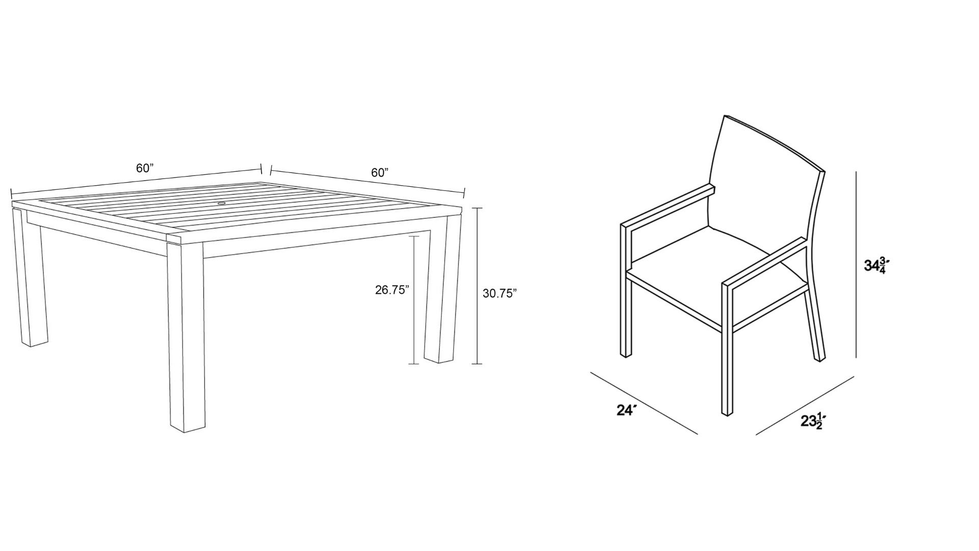 - Dining Table: 60″ x 60″ x 30″H (125lbs.)