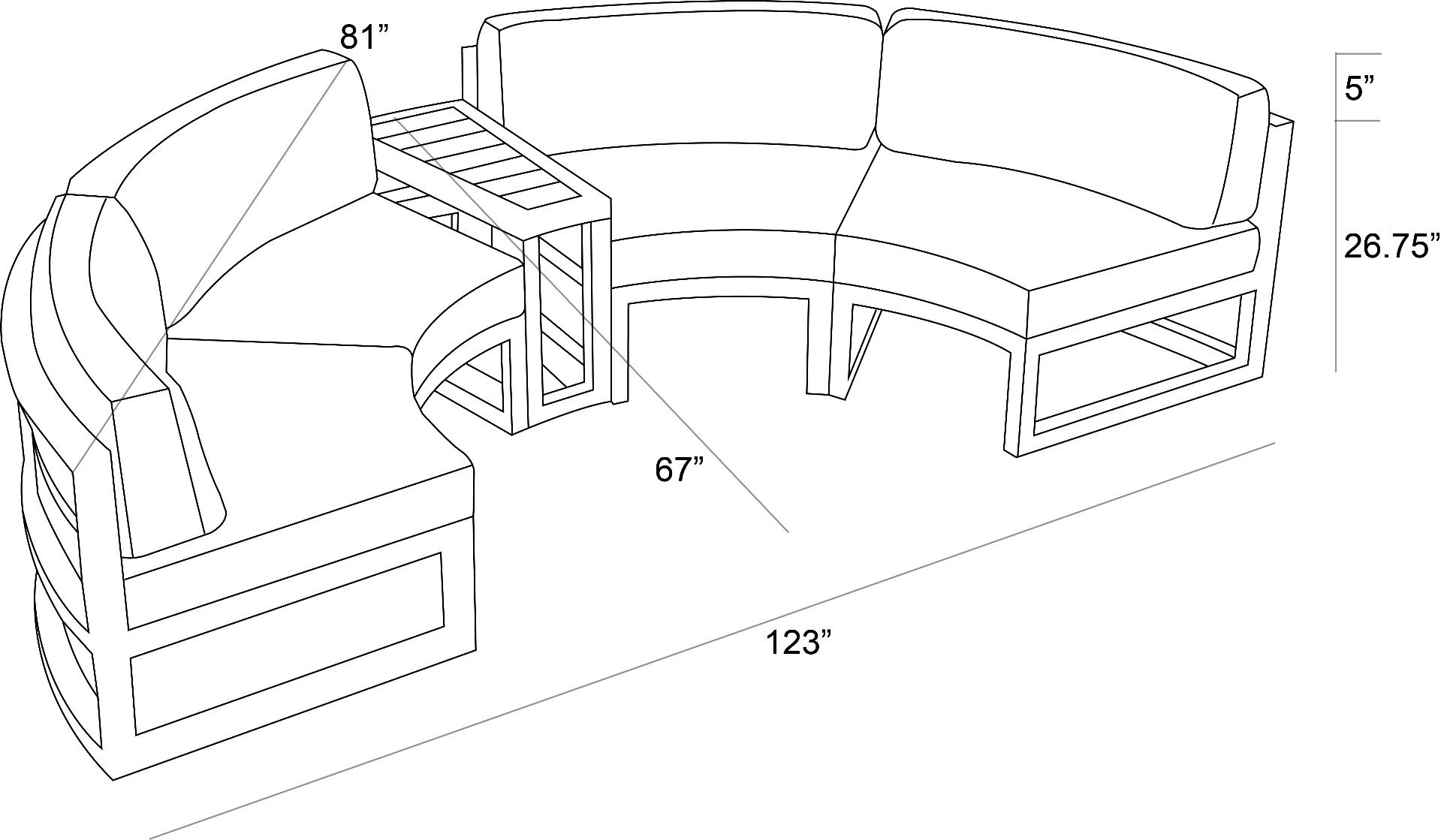 - Curve Loveseat: 80.75″W x 32″D x 26.75″H (35 lbs.)