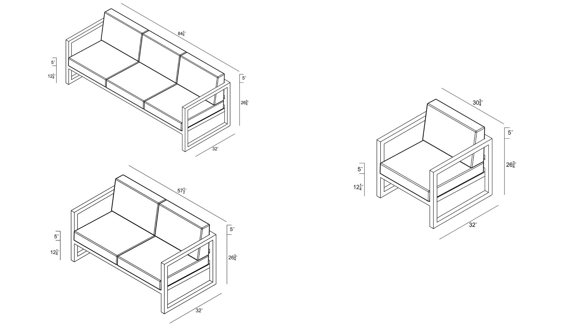 - Loveseat: 57.5″W x 32″D x 33″H (35lbs.)