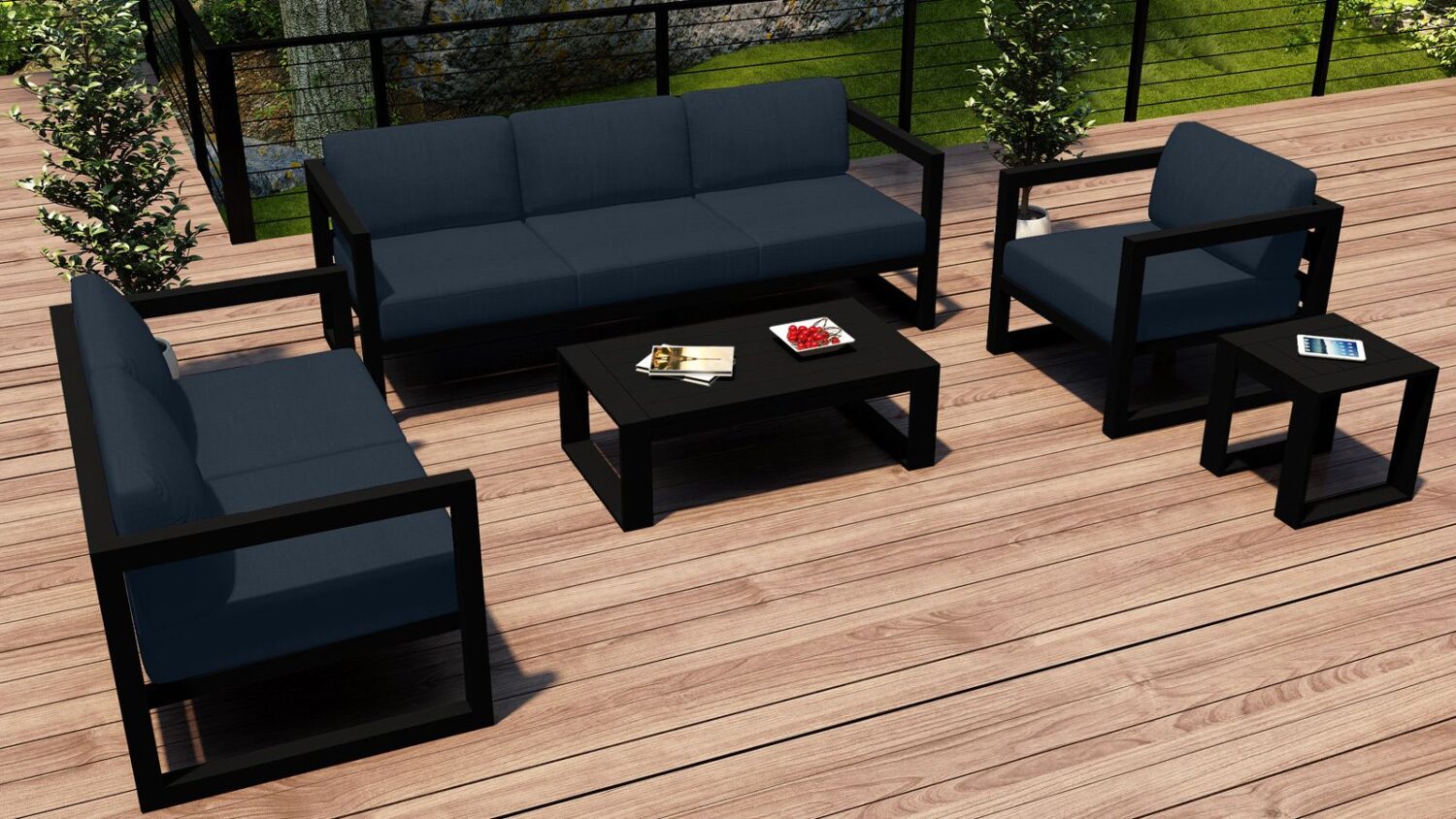An inspired blend of Midcentury Modernism and contemporary lines, the 5 Piece Avion Sofa Set by Harmonia Living brings artful design to your outdoor space. The hallmarks of the collection include durable aluminum metalwork, a sleek silhouette, and extra-spacious deep seating. Stain-resistant Sunbrella® fabric cushions and weather-resistant powder-coated frames make Avion as sensible as it is stylish. If you wish to order this set through Harmonia Living’s Quick Ship program, make sure to select a Quick Ship (QS) fabric before checkout! All cushions are made in the USA from Sunbrella, Outdura, and Revolution performance fabrics which carry a 5 year fade warranty.