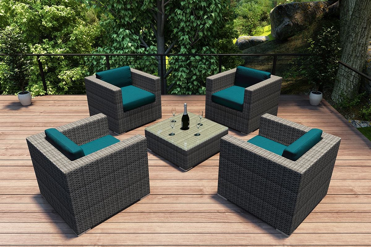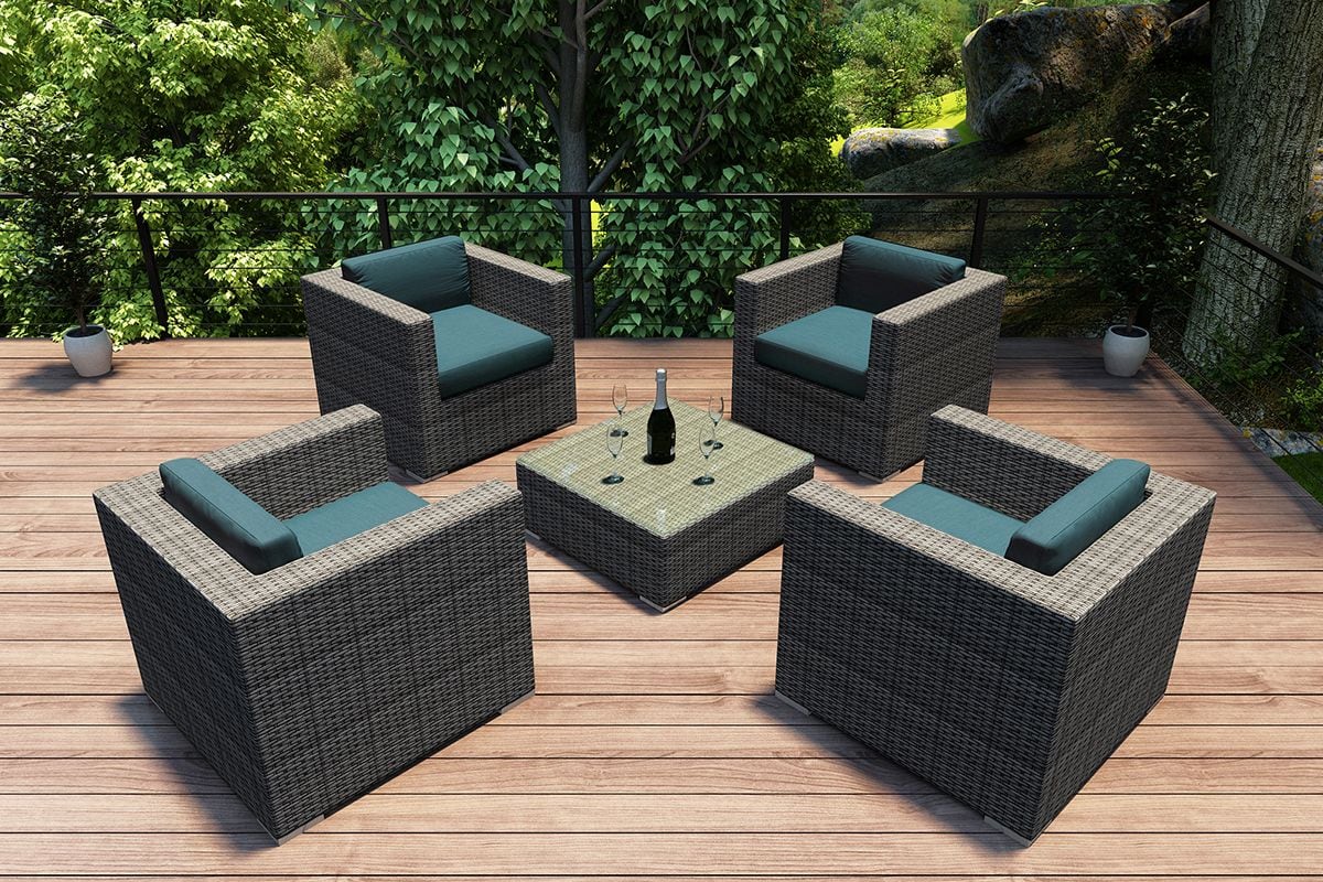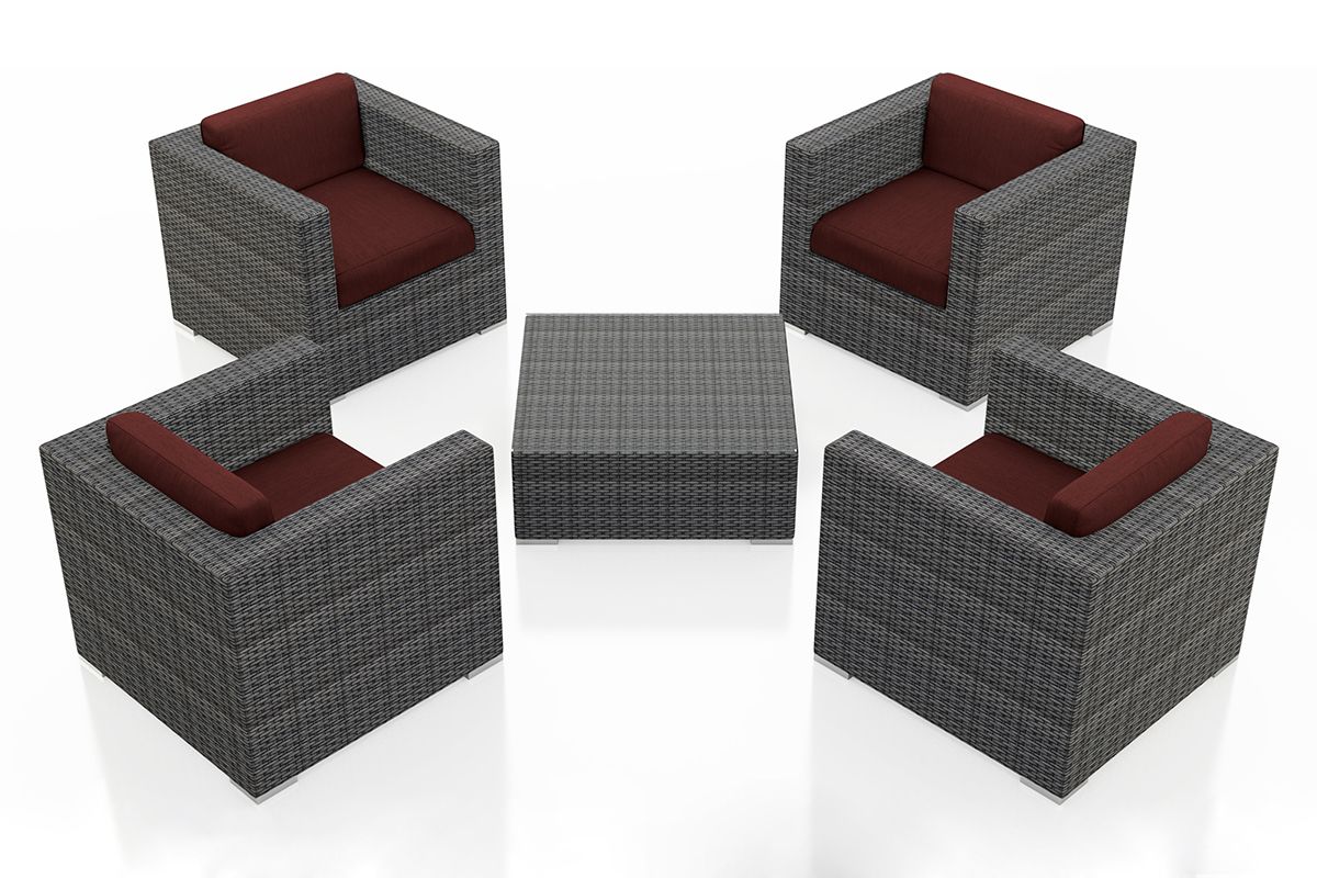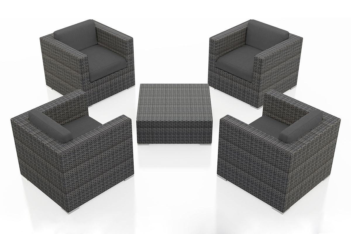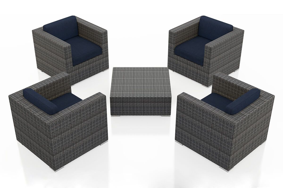 The District 5 Piece 4-Seat Club Chair Set by Harmonia Living is designed to provide plenty of seating room and ensure your total comfort as you unwind outdoors. This collection’s high arms, flat, woven design and weathered look give it a unique visual appeal, while sturdy, all-weather construction ensures lasting performance across the seasons. The wicker is made with durable High-Density Polyethylene (HDPE) and finished in a beautiful Textured Slate color, which gives it a natural feel. Its sturdy aluminum frames, triple reinforced seats and fade resistant cushions are made to endure in any outdoor setting, rain or shine. The coffee table is topped with extra strong tempered glass, a finishing touch that is ideal for frequent use. If you wish to order this set through Harmonia Living’s Quick Ship program, make sure to select a Quick Ship (QS) fabric before checkout! All cushions are made in the USA from Sunbrella, Outdura, and Revolution performance fabrics which carry a 5 year fade warranty. This set comes with 4 Club Chairs and 1 Square Coffee Table, perfect for your patio or outdoor lounge.