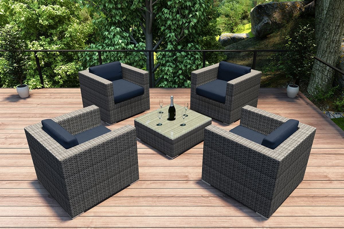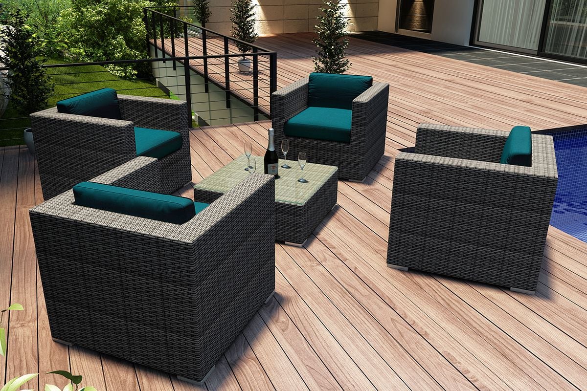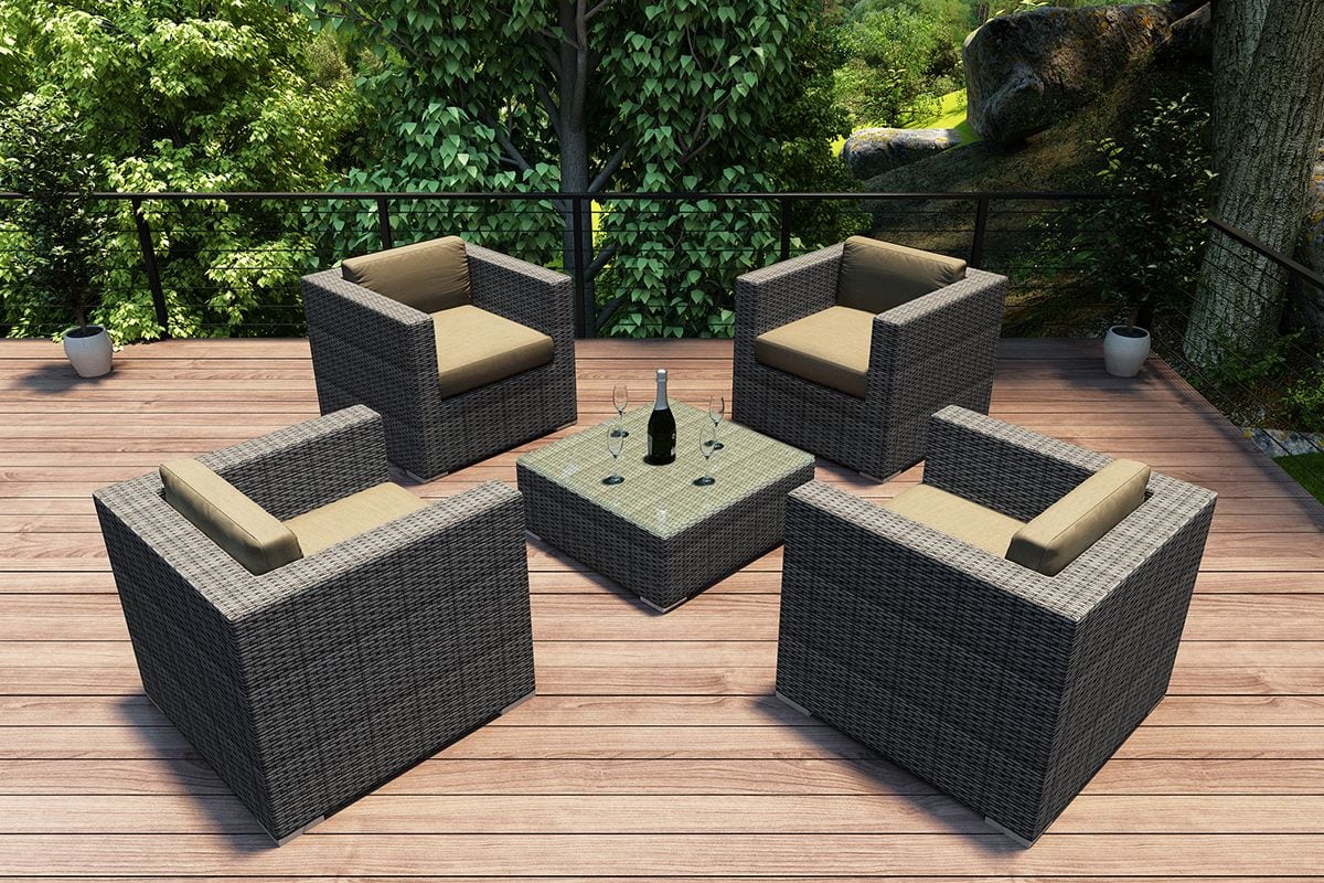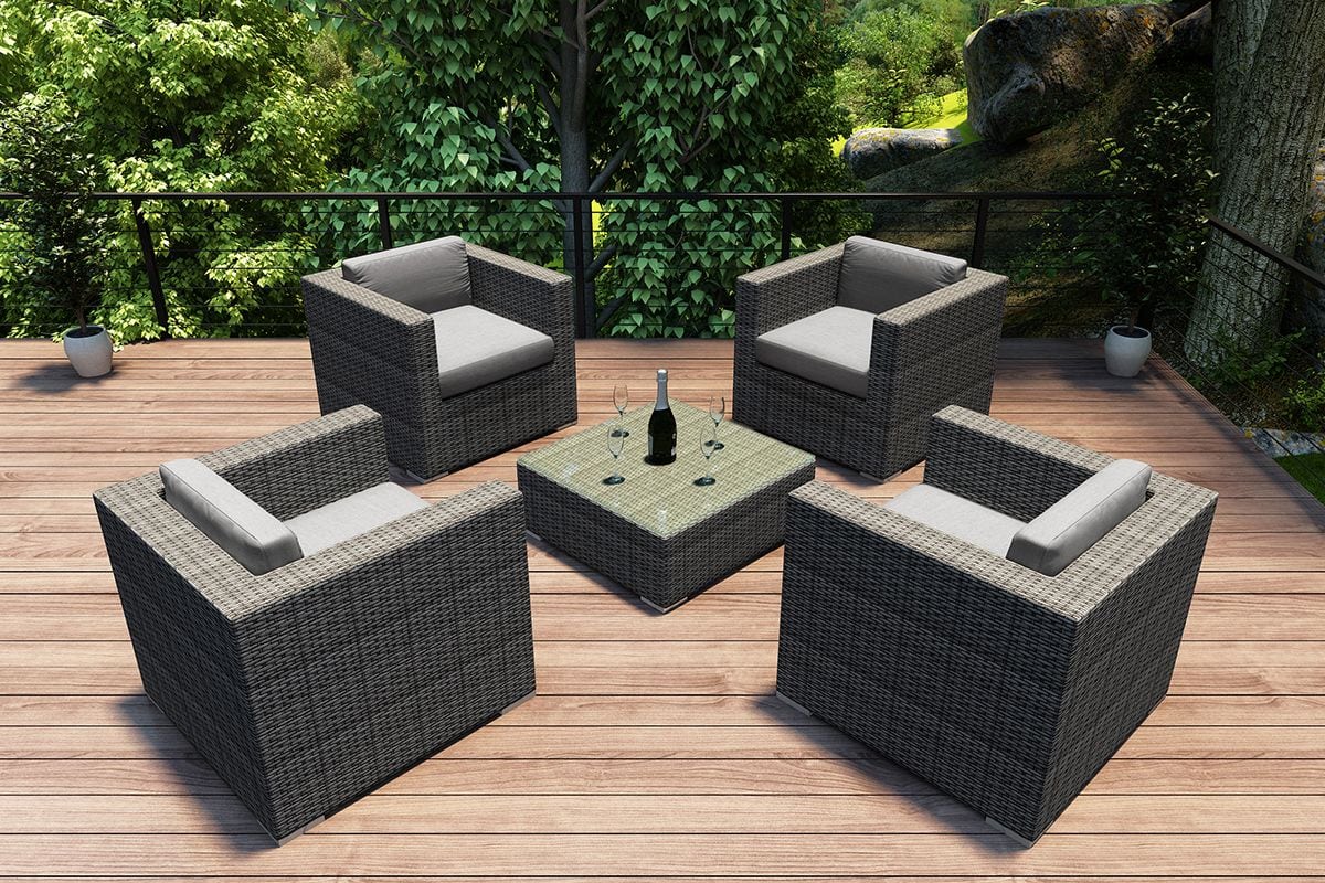 The District 5 Piece 4-Seat Club Chair Set by Harmonia Living is designed to provide plenty of seating room and ensure your total comfort as you unwind outdoors. This collection’s high arms, flat, woven design and weathered look give it a unique visual appeal, while sturdy, all-weather construction ensures lasting performance across the seasons. The wicker is made with durable High-Density Polyethylene (HDPE) and finished in a beautiful Textured Slate color, which gives it a natural feel. Its sturdy aluminum frames, triple reinforced seats and fade resistant cushions are made to endure in any outdoor setting, rain or shine. The coffee table is topped with extra strong tempered glass, a finishing touch that is ideal for frequent use. If you wish to order this set through Harmonia Living’s Quick Ship program, make sure to select a Quick Ship (QS) fabric before checkout! All cushions are made in the USA from Sunbrella, Outdura, and Revolution performance fabrics which carry a 5 year fade warranty. This set comes with 4 Club Chairs and 1 Square Coffee Table, perfect for your patio or outdoor lounge.