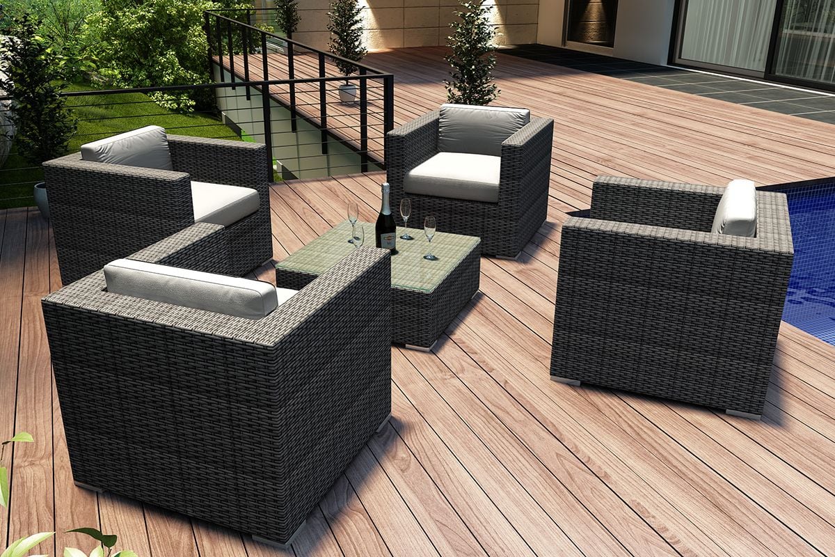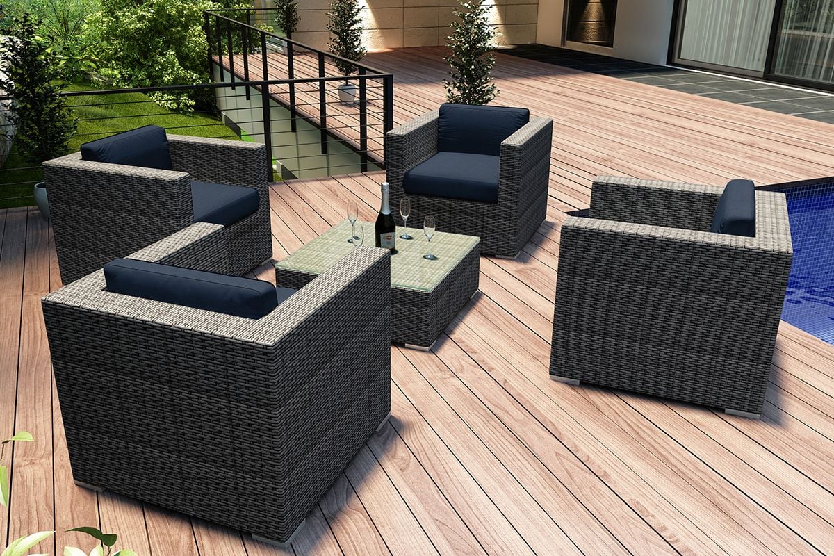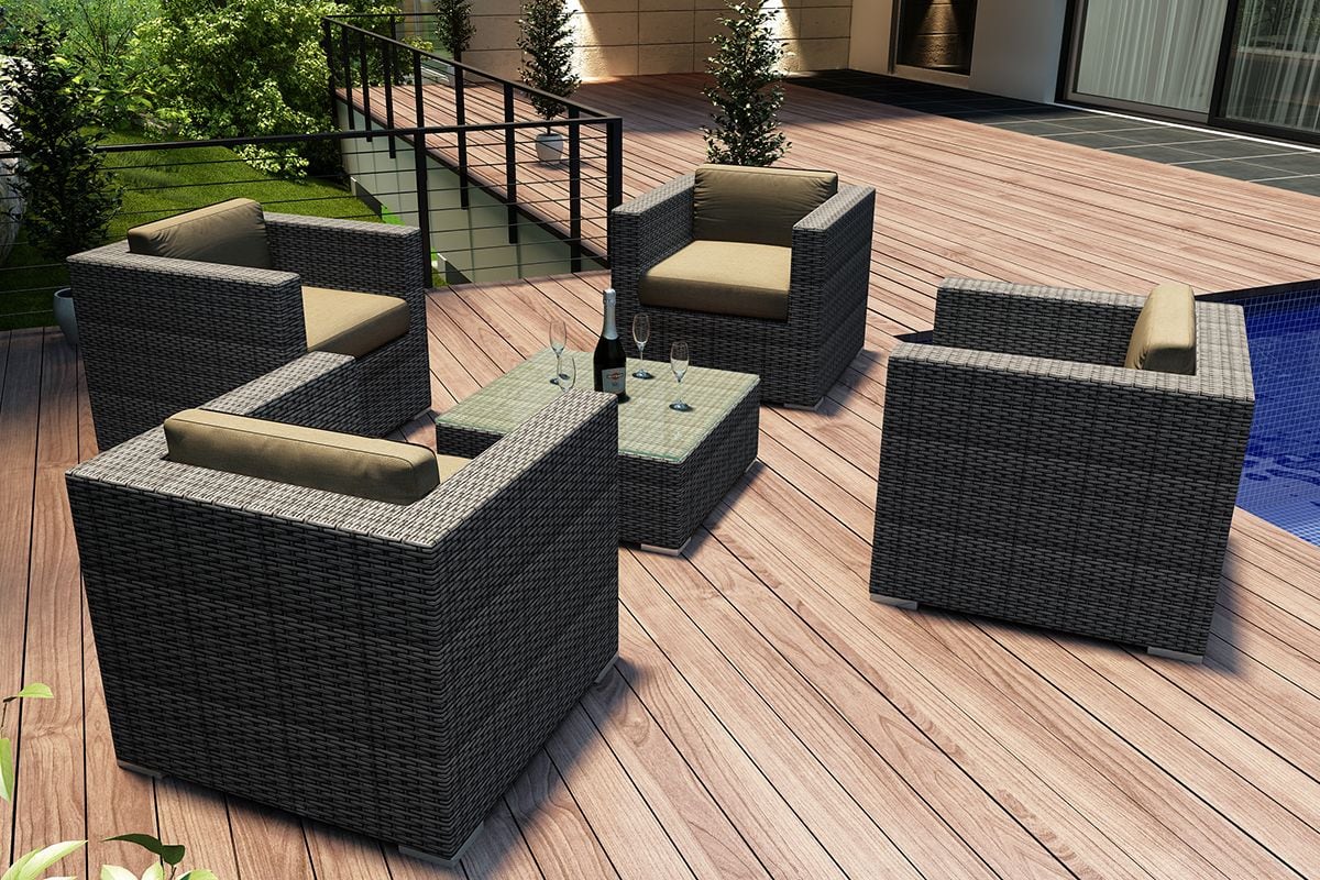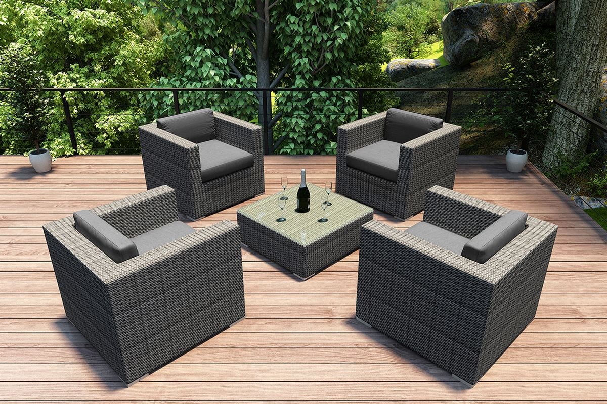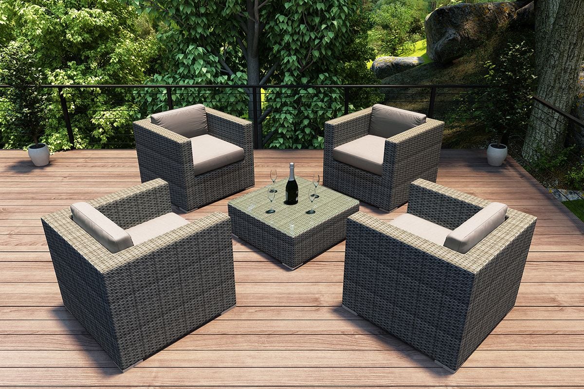 The District 5 Piece 4-Seat Club Chair Set by Harmonia Living is designed to provide plenty of seating room and ensure your total comfort as you unwind outdoors. This collection’s high arms, flat, woven design and weathered look give it a unique visual appeal, while sturdy, all-weather construction ensures lasting performance across the seasons. The wicker is made with durable High-Density Polyethylene (HDPE) and finished in a beautiful Textured Slate color, which gives it a natural feel. Its sturdy aluminum frames, triple reinforced seats and fade resistant cushions are made to endure in any outdoor setting, rain or shine. The coffee table is topped with extra strong tempered glass, a finishing touch that is ideal for frequent use. If you wish to order this set through Harmonia Living’s Quick Ship program, make sure to select a Quick Ship (QS) fabric before checkout! All cushions are made in the USA from Sunbrella, Outdura, and Revolution performance fabrics which carry a 5 year fade warranty. This set comes with 4 Club Chairs and 1 Square Coffee Table, perfect for your patio or outdoor lounge.
