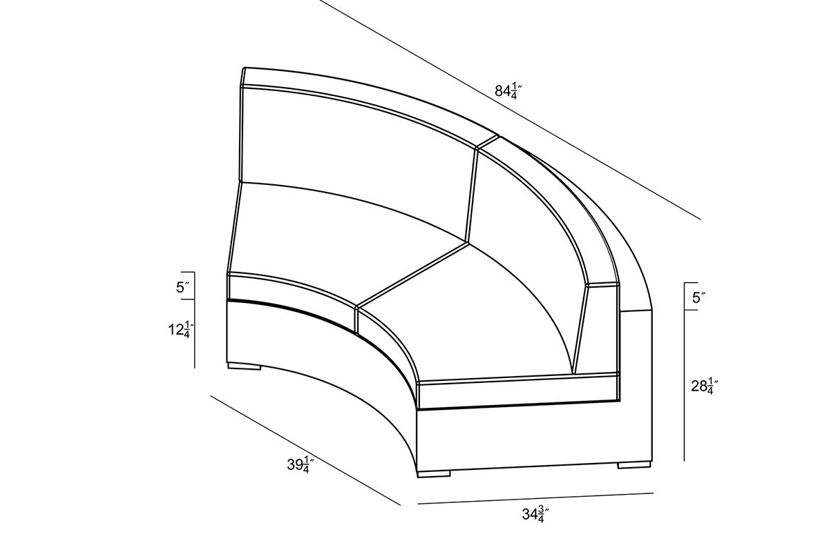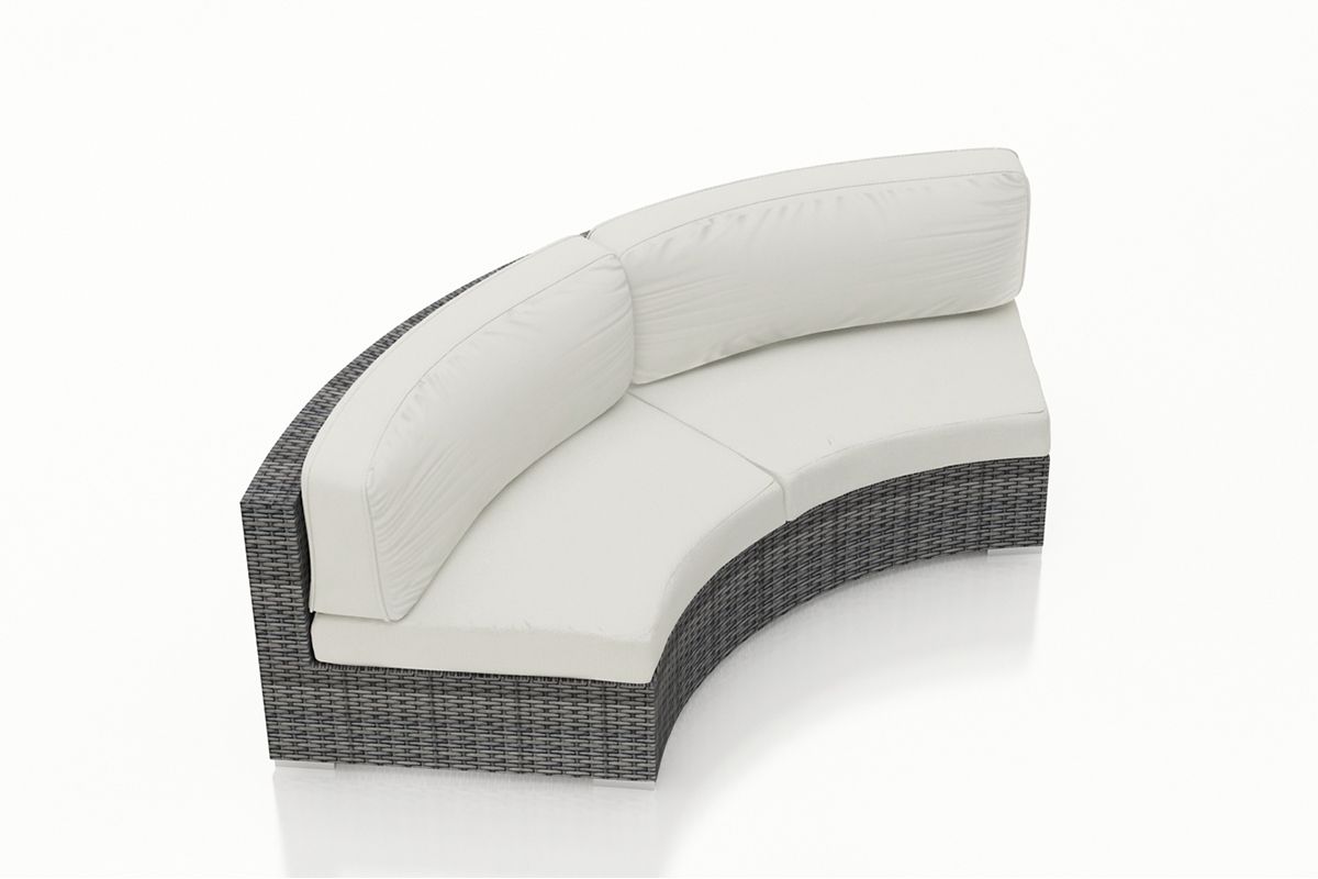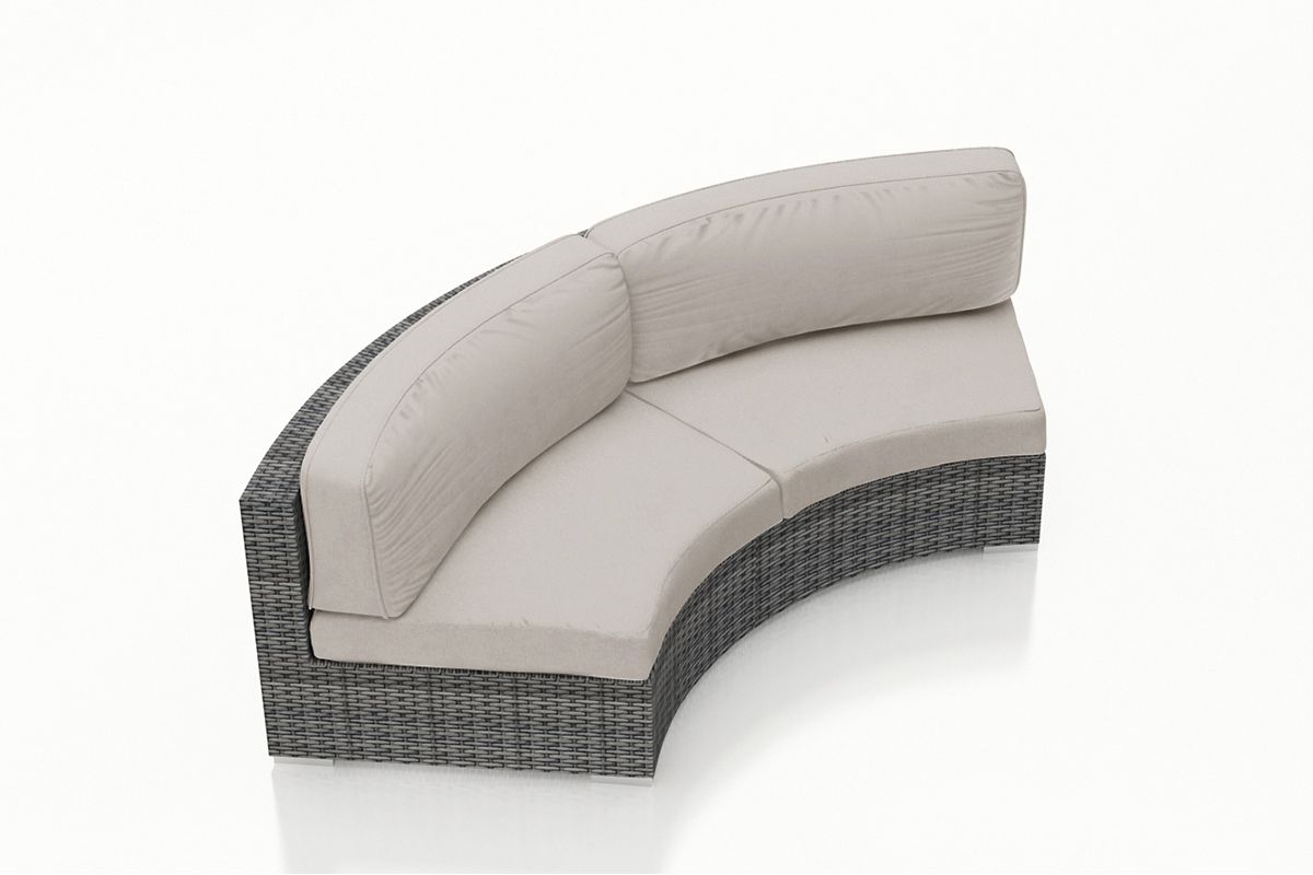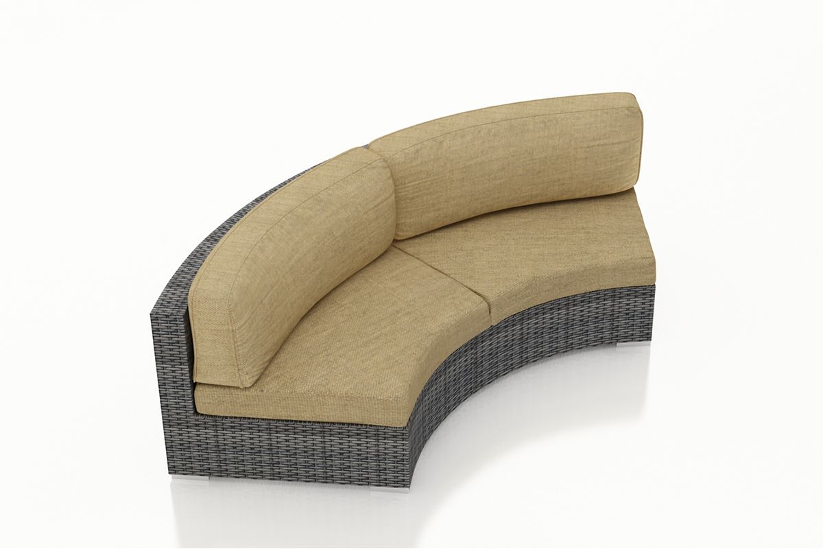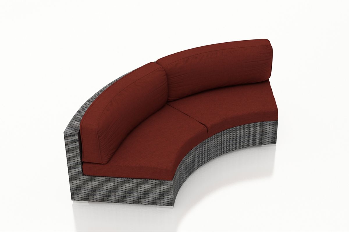 The District Curved Loveseat by Harmonia Living brings a cozy, rustic appeal to modern outdoor dining furniture. This collection’s flat, woven design and weathered look give it a unique visual appeal, while sturdy, all-weather construction ensures lasting performance across the seasons. The wicker is made with durable High-Density Polyethylene (HDPE) and finished in a beautiful Textured Slate color, which gives it a natural feel. Its sturdy aluminum frame, triple reinforced seat and fade resistant cushions are made to endure in any outdoor setting, rain or shine. If you wish to order this piece through Harmonia Living’s Quick Ship program, make sure to select a Quick Ship (QS) fabric before checkout! All cushions are made in the USA from Sunbrella, Outdura, and Revolution performance fabrics which carry a 5 year fade warranty. This piece does not have arms, which allows for multiple units to be combined for a circular sectional seating group.