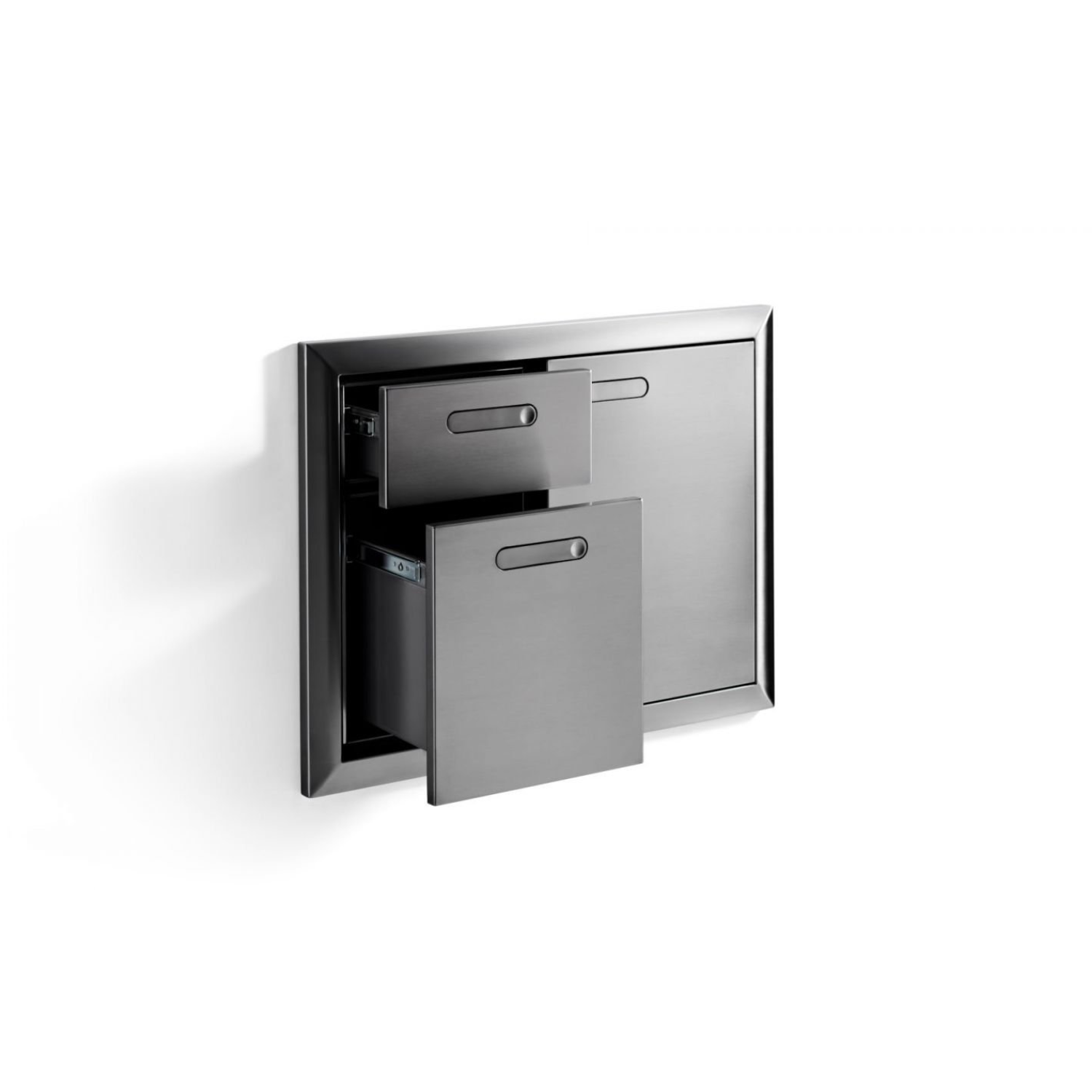 The slim, recessed stainless steel handles maintain the minimalist look of the Ventana line while providing ergonomic access. The low-profile design keeps the overall aesthetic clean and modern.