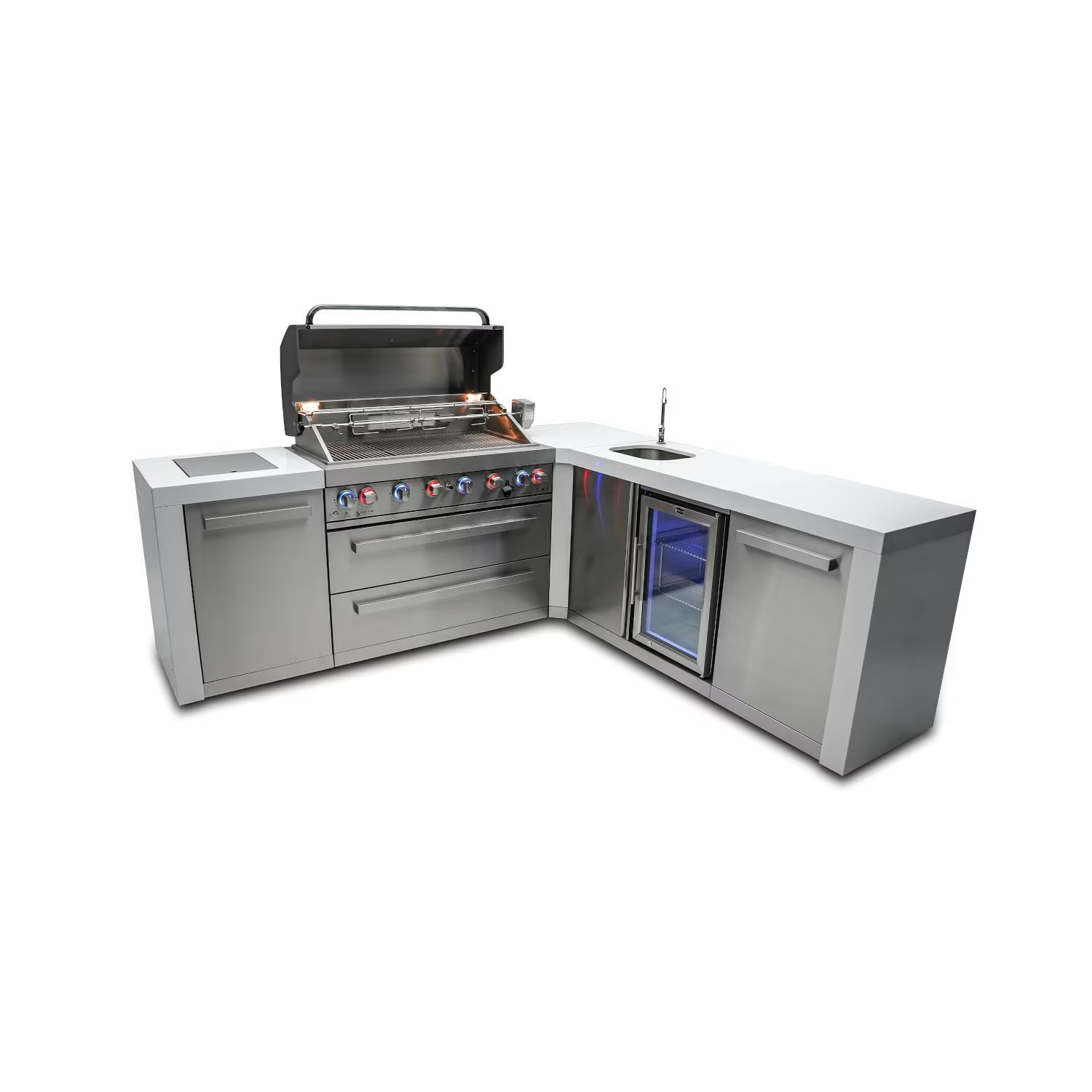 Mont Alpi Deluxe Series L-Shaped Propane Outdoor Kitchen Island w/ Side Burner & Beverage Center – MAi805-D90BEV