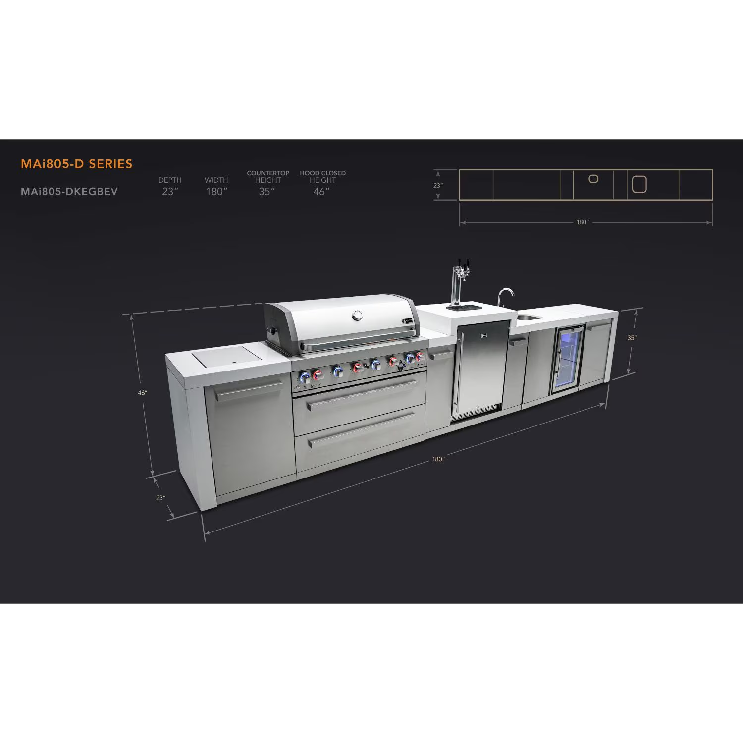 The MAi805-DKEGBEV is the ultimate deluxe outdoor kitchen island, combining powerful grilling, infrared cooking versatility, integrated beverage service, and a built-in triple-tap kegerator in an expansive 15-foot layout. With premium materials, deluxe accessories included, and no custom construction required, it’s the perfect choice for homeowners who want to entertain big and cook in absolute style.
