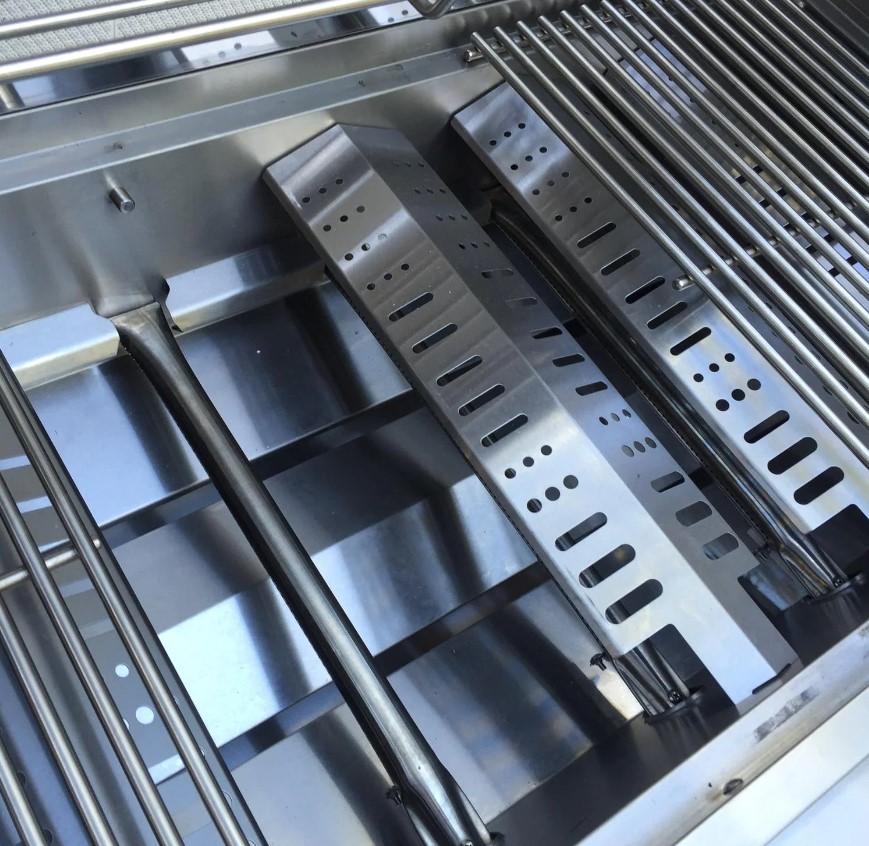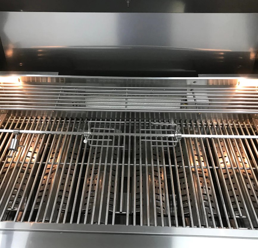 The 805 Built-In Gas Grill features an all 304 stainless steel construction for corrosion resistance and durability. The lid is double lined for superb heat retention and has a temperature gauge on front. The main cooking area measures 38 x 18 inches, and consists of 8mm stainless steel cooking grids. A stainless steel warming rack is also standard. Beneath the cooking surface are 6 double layered stainless steel Heatwave flame tamers that provide even heat distribution and protect the 6 tubular stainless steel high-efficiency 12,000 BTU burners that sit below them. In the rear of the grill is a ceramic infrared burner for the included heavy duty rotisserie kit. The interior of the grill is lit by dual halogen lights, perfect for cooking after dark. The front control panel houses the control knobs, lit by blue LED light, the electronic ignition switch, and a bottle opener for having a drink while tending the grill. The pull-out grease tray makes cleaning up after an afternoon of barbecuing a snap. An all-weather cover is included to protect the grill from the outdoor elements when not in use. The grill comes with a propane hose and regulator, but can be converted to natural gas in under 30 minutes with the optional natural gas conversion kit, sold separately.