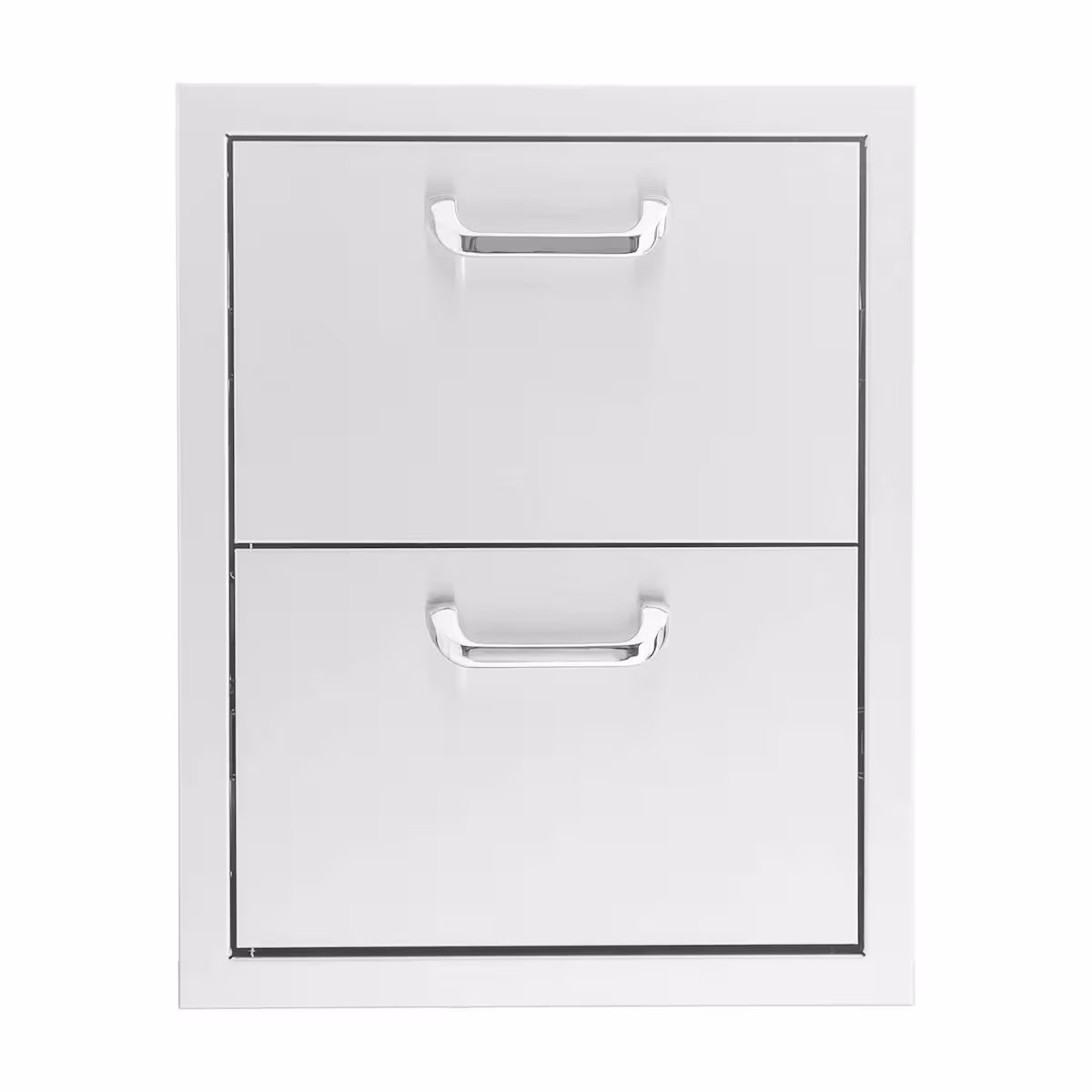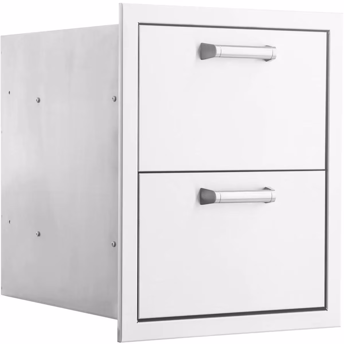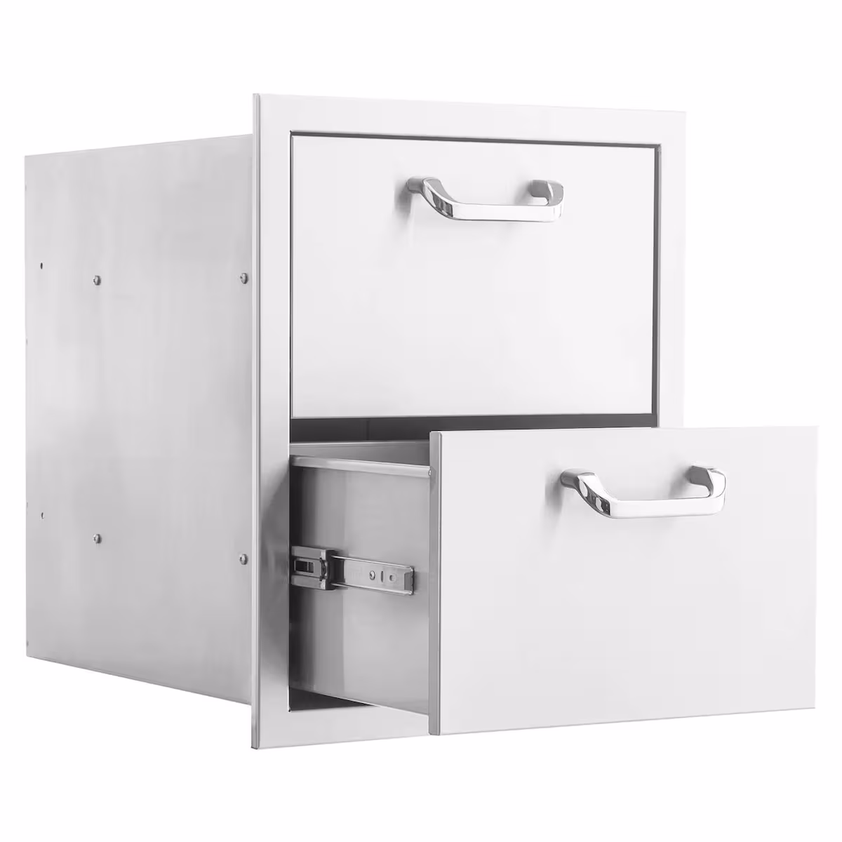 This 16-Inch stainless steel double access drawer is constructed with a 20 gauge 304 stainless steel frame and number 4 brushed finish. Unit is flush mounted, and the drawers use heavy-duty, commercial grade ball bearing drawer glides on full length drawer tracks for easy opening and closing. An access drawer is the perfect outdoor kitchen accessory for any outdoor BBQ island, adding storage space for your tools and spices. The handles require installation on this double access drawer. Product does not include installation hardware or instructions. Internal Drawer Dimensions: 13 7/8 W X 19 3/8 D X 7 3/4 H.