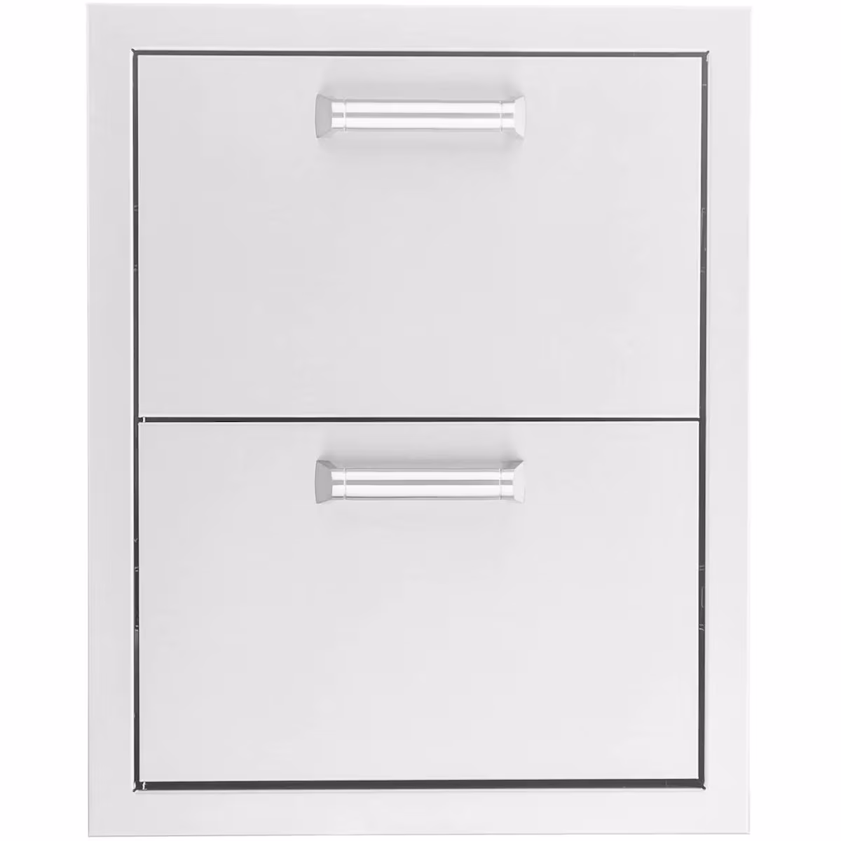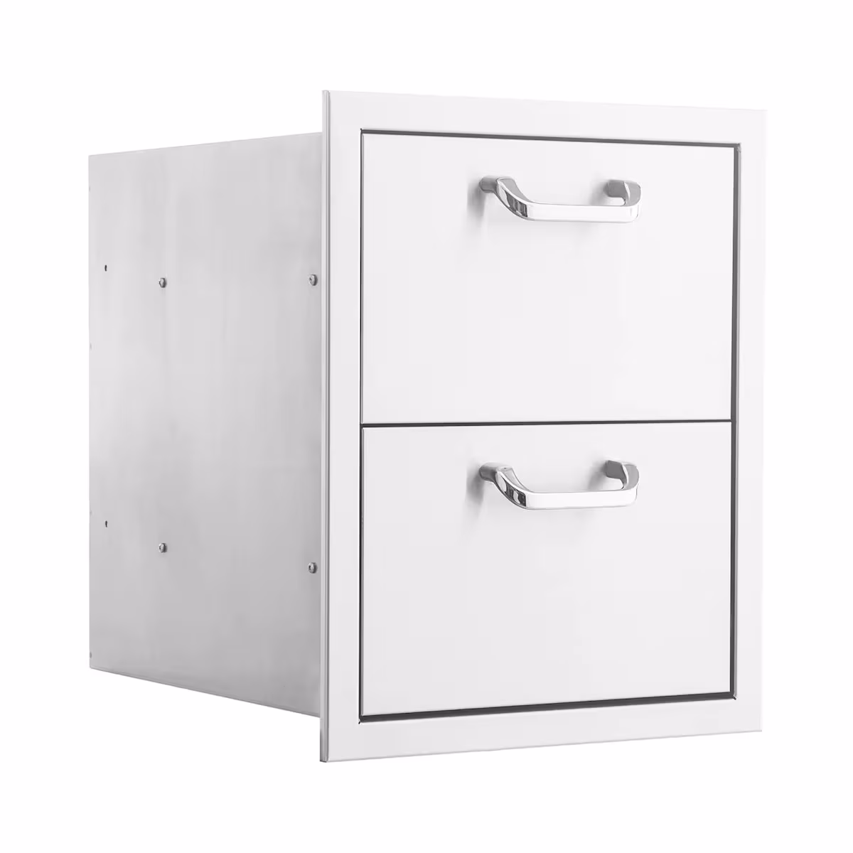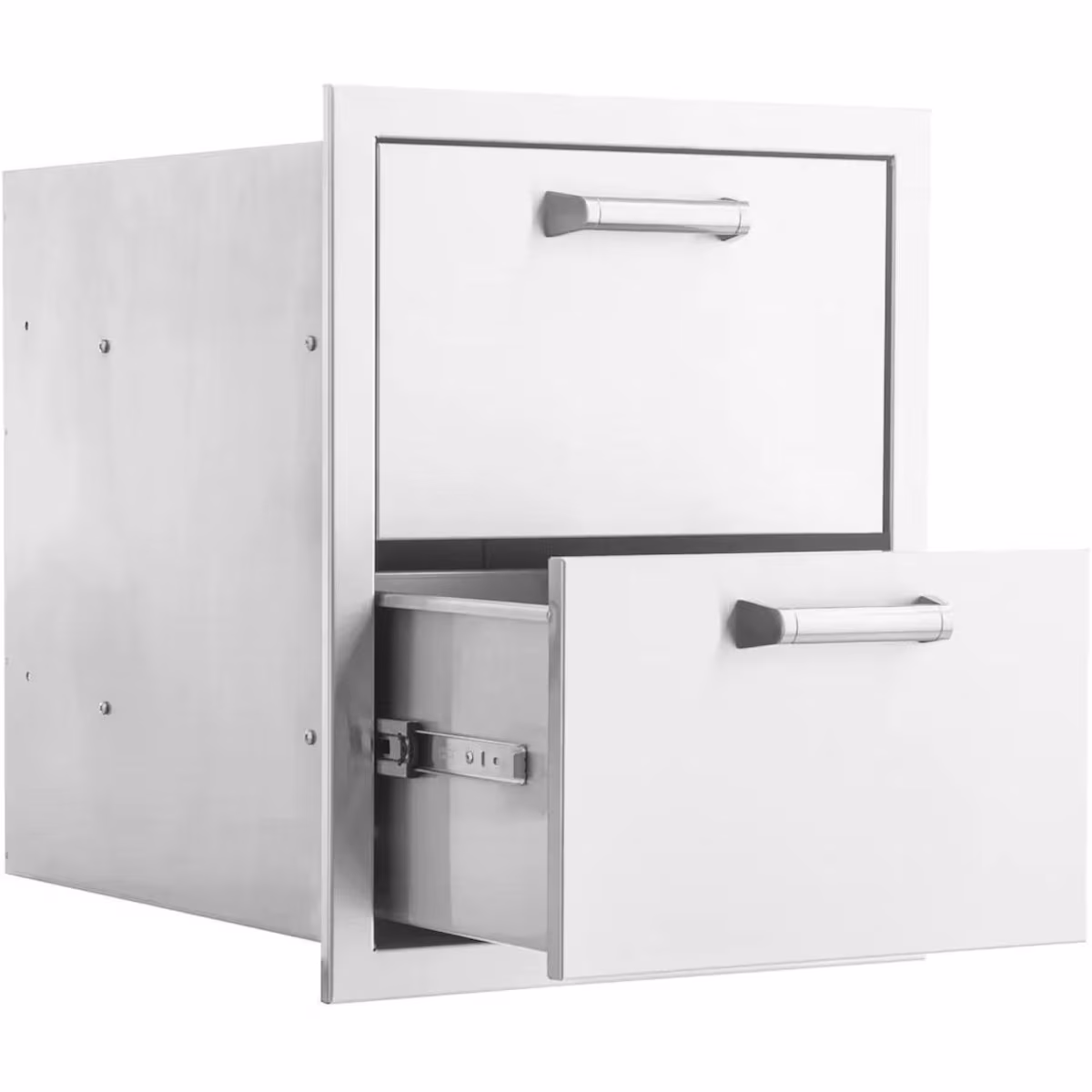 This 16-Inch stainless steel double access drawer is constructed with a 20 gauge 304 stainless steel frame and number 4 brushed finish. Unit is flush mounted, and the drawers use heavy-duty, commercial grade ball bearing drawer glides on full length drawer tracks for easy opening and closing. An access drawer is the perfect outdoor kitchen accessory for any outdoor BBQ island, adding storage space for your tools and spices. The handles require installation on this double access drawer. Product does not include installation hardware or instructions. Internal Drawer Dimensions: 13 7/8 W X 19 3/8 D X 7 3/4 H.