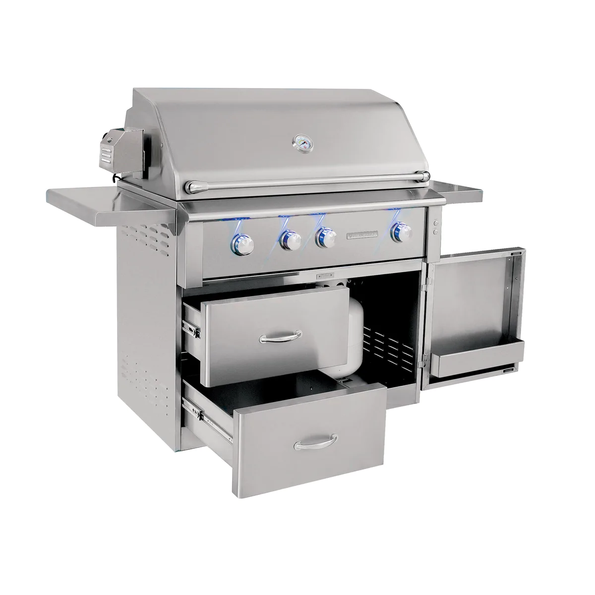 - Freestanding Grill Cart: Constructed from 443-grade stainless steel, the 42-inch cart includes two drawers, adjustable shelves, an inner condiment tray, and locking casters for easy mobility and convenience.