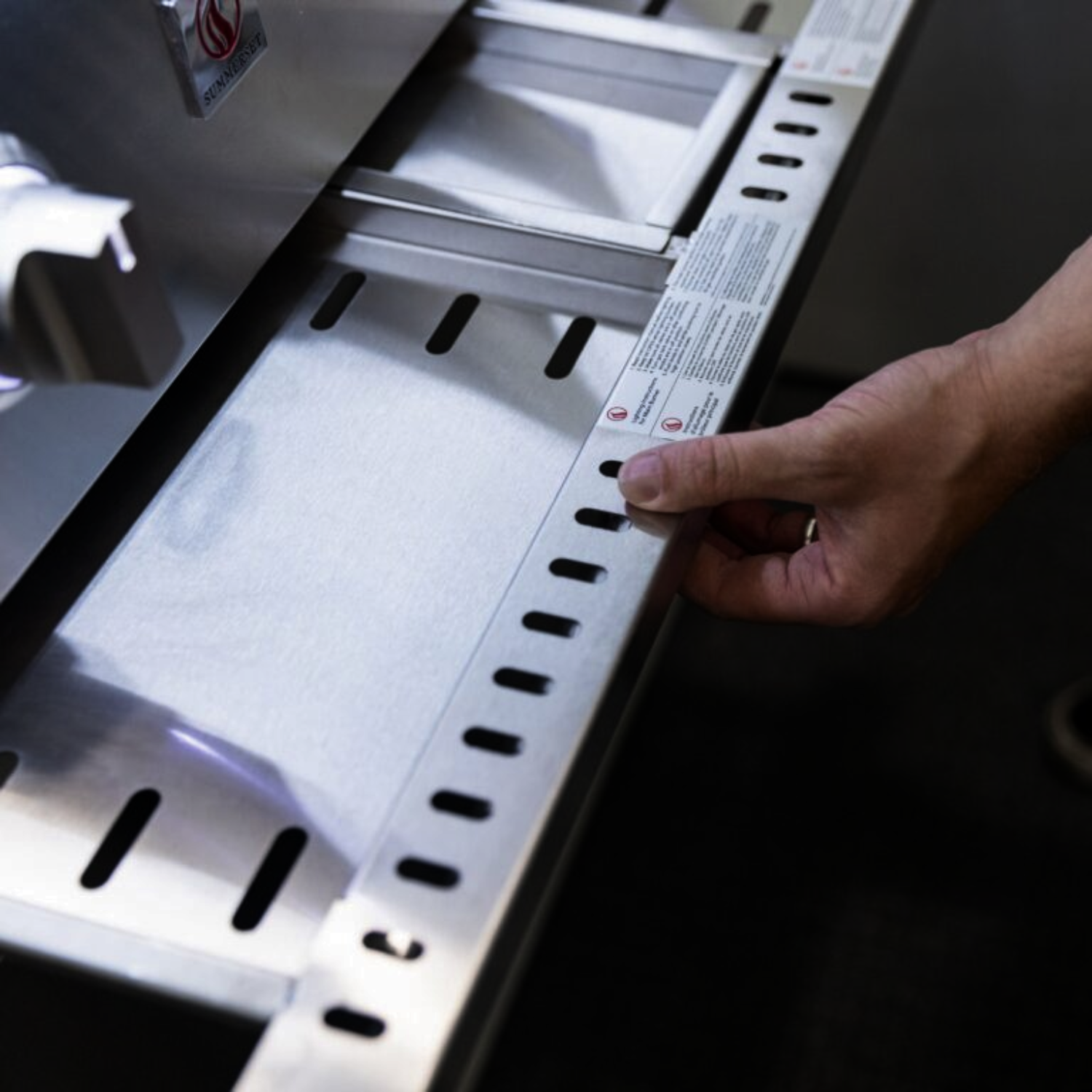 Fits a 28 ½″ W × 19 ¾″ D × 10 ¼″ H cut-out and hooks directly to propane. A full-width front drip tray glides out on smooth tracks, and dishwasher-safe briquette trays make post-cook cleanup a breeze.