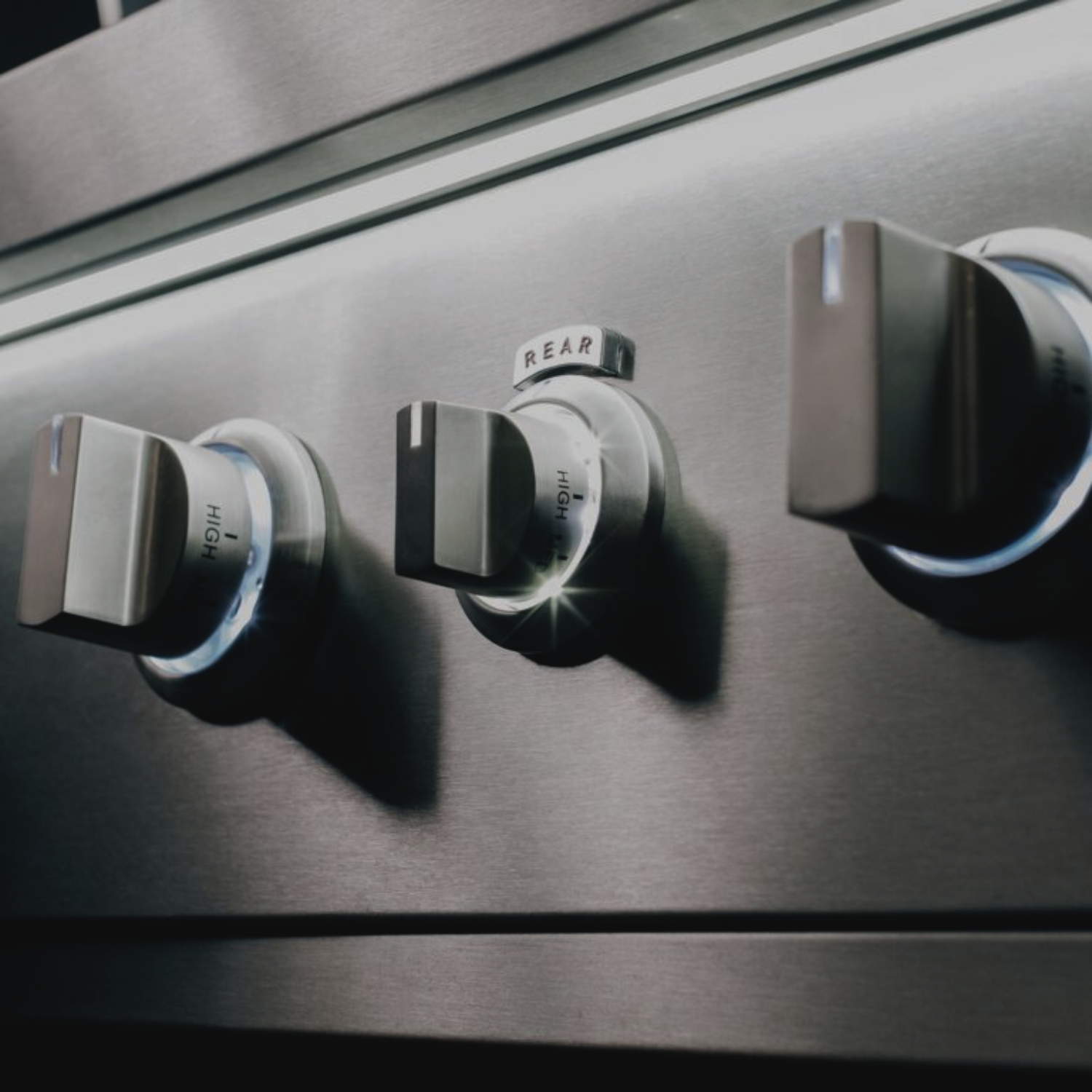 💡 Waterfall LED Strip & White‑to‑Red Bezel Lights – Blue accent strip across the fascia; knobs glow white on standby and shift to red when burners ignite.