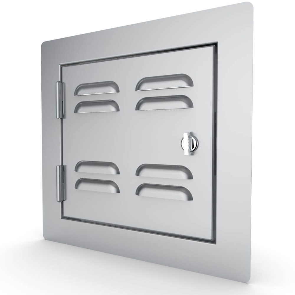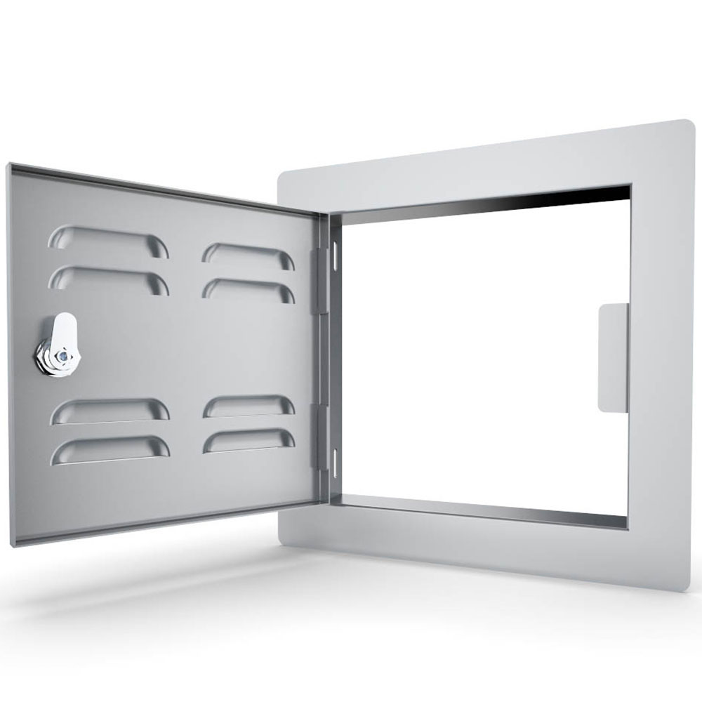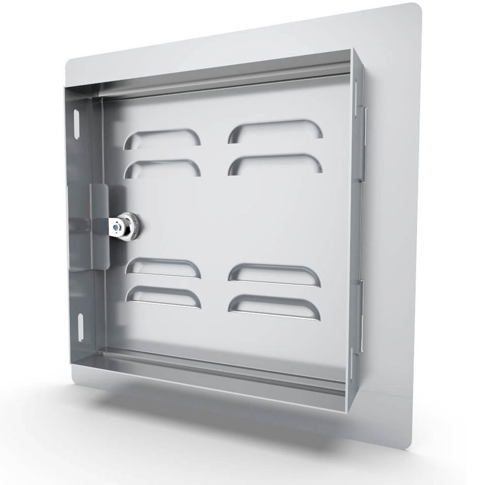 The Sunstone Classic Series Flush Style Left or Right Swing 12” x 12” Vented Access Door is your perfect solution for Outdoor Plumbing, Gas, Electrical, or Safety Access great for multiple installation types like Dry-Wall Board, Brick, or Veneer Stone. In addition, this door is great for accessing the Bottom Vent of a Ceramic Grill with its added vents provide great air-circulation and features a Turn-Latch which can be optionally replaced for a Locking Latch keeping internal components safe. Also use this Door in Place of an Outdoor Kitchen Island Vent, providing superb air-flow or gas-ventilation while giving you clear access to the internal compartment.