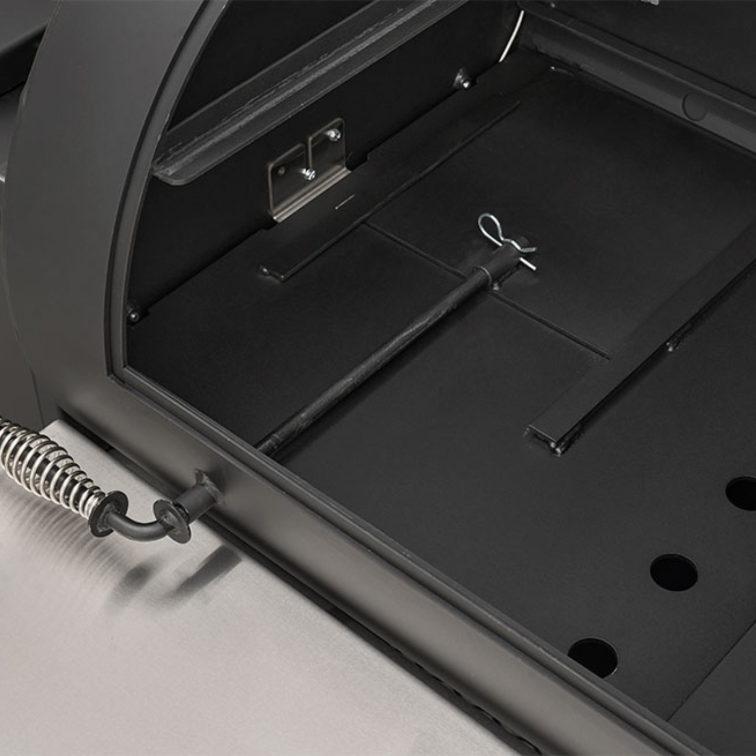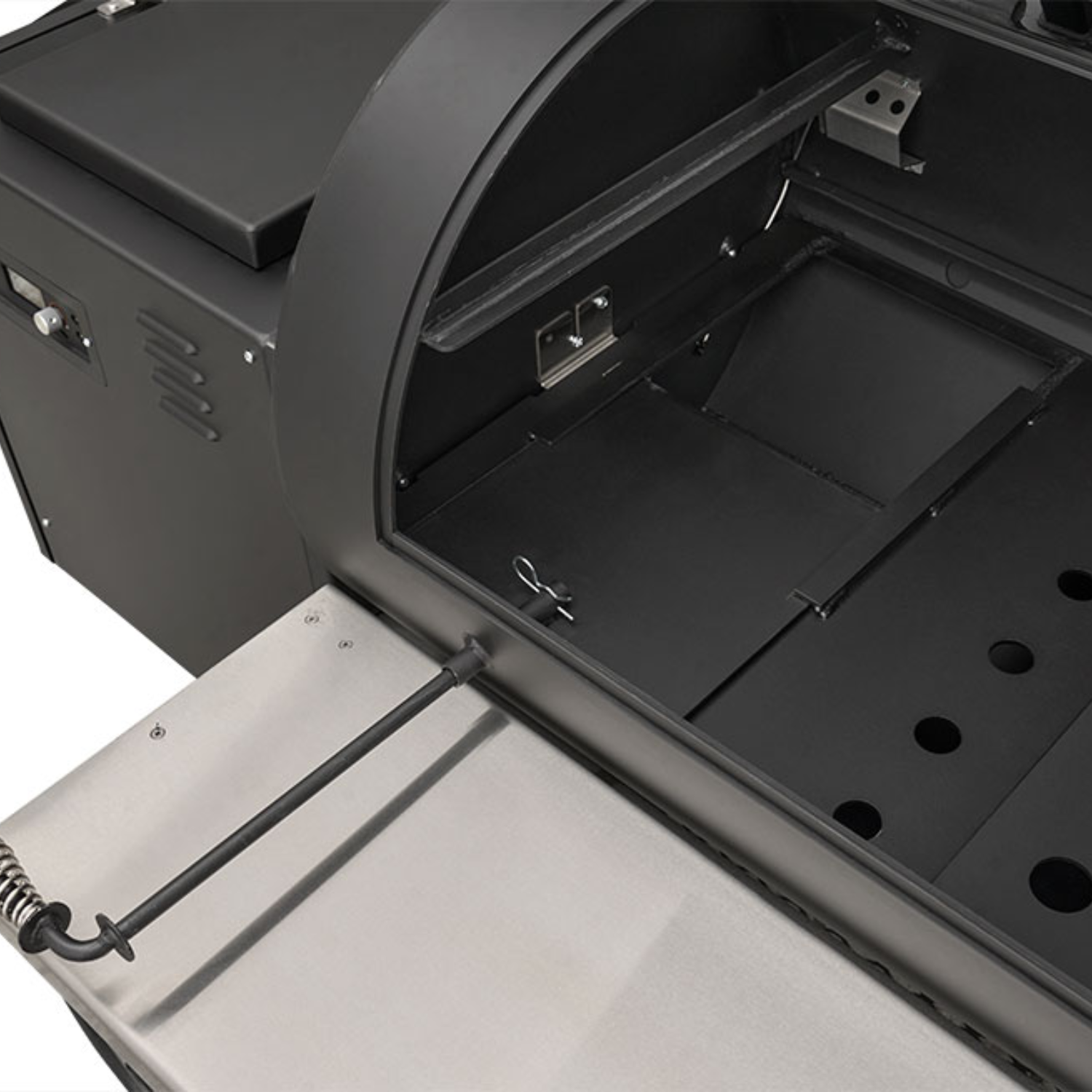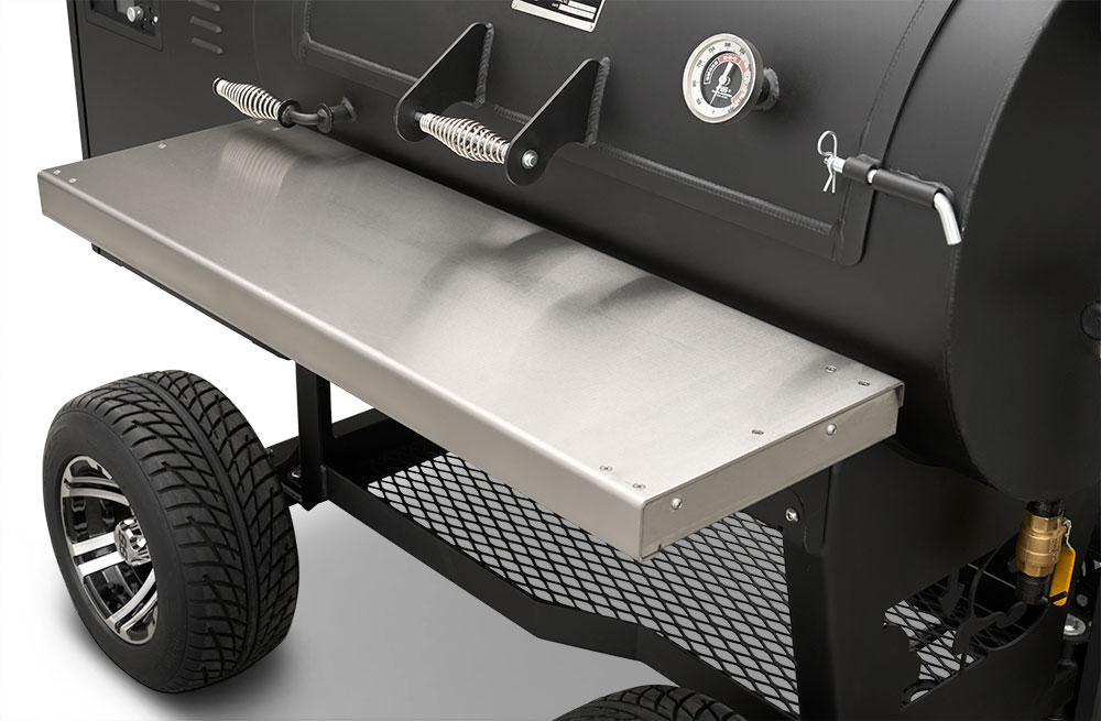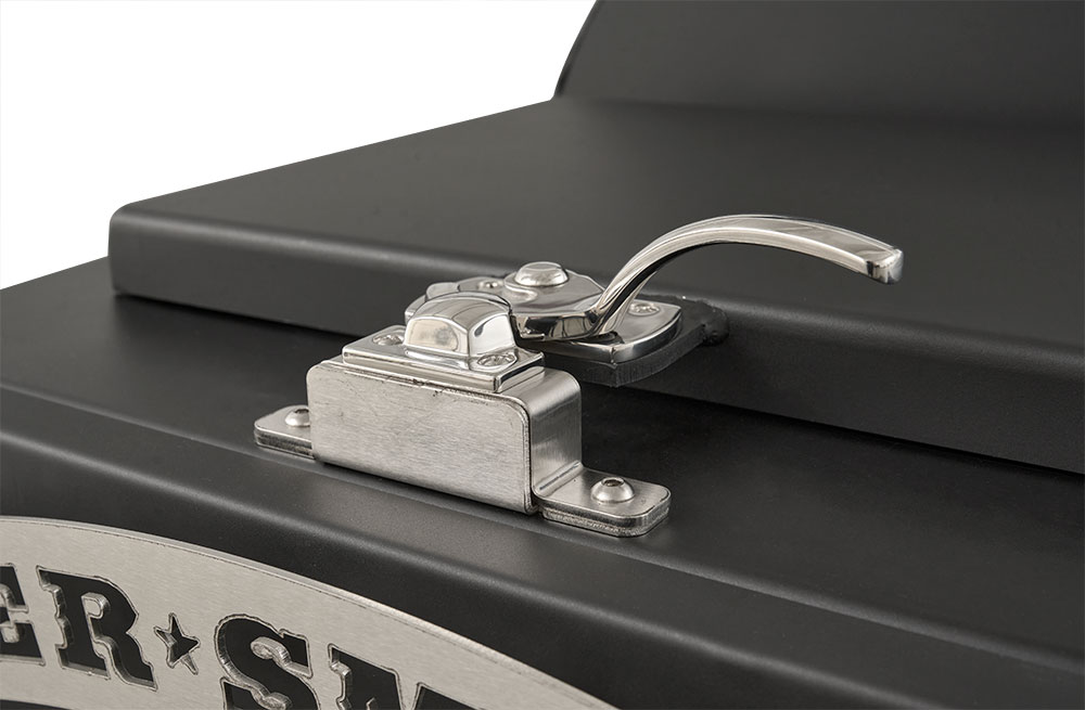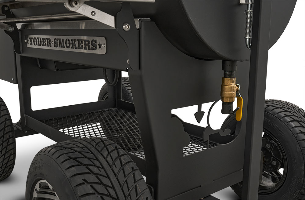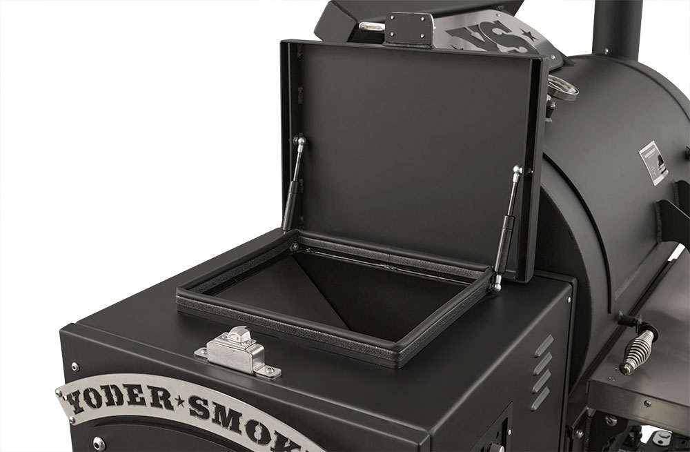 At its core is Yoder’s legendary heat management system—allowing you to grill, smoke, and even bake from 175° to 500°F with precision and confidence. Open the heat management plate door with a simple pull of the handle to access direct searing power without removing grates, while the slide-out top shelf gives you full access for basting, wrapping, or moving food mid-cook.