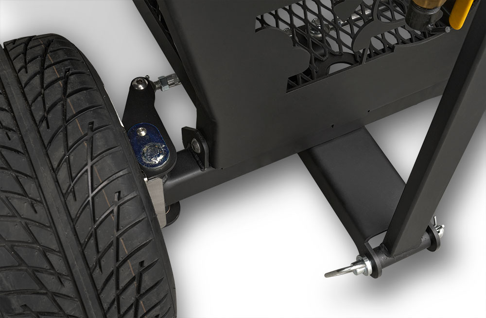 The competition-ready chassis rides on semi-pneumatic tires for confident mobility over rough terrain, while the integrated pull handle and built-in tie-downs make loading and transport easy for events and competitions.