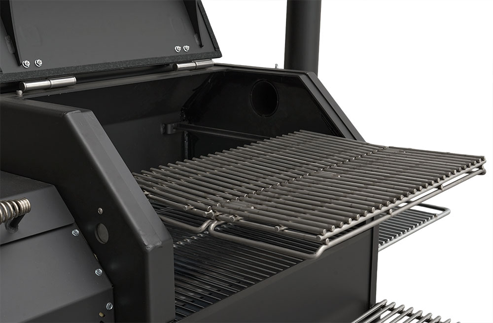 The 10-gauge steel cooking chamber delivers exceptional durability and consistent airflow, while the 10-gauge steel competition cart—finished in high-temp powder coat—stands up to year-round use with ease.